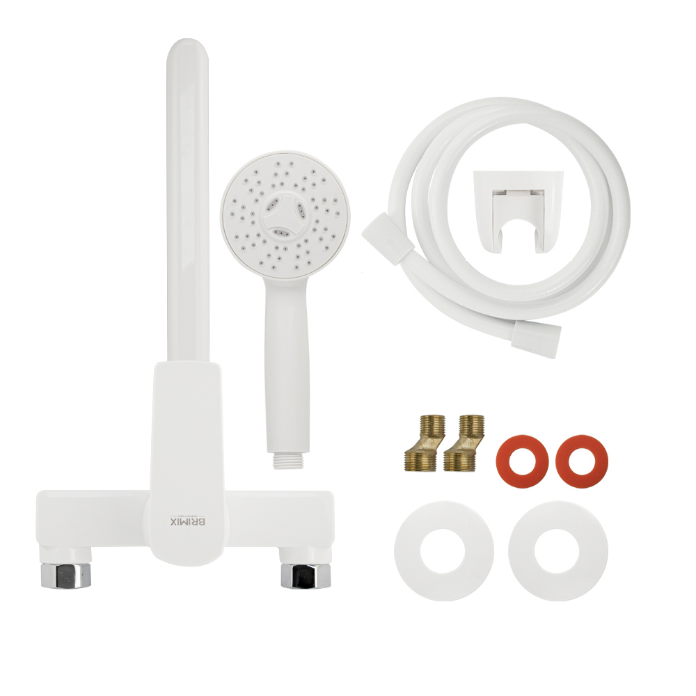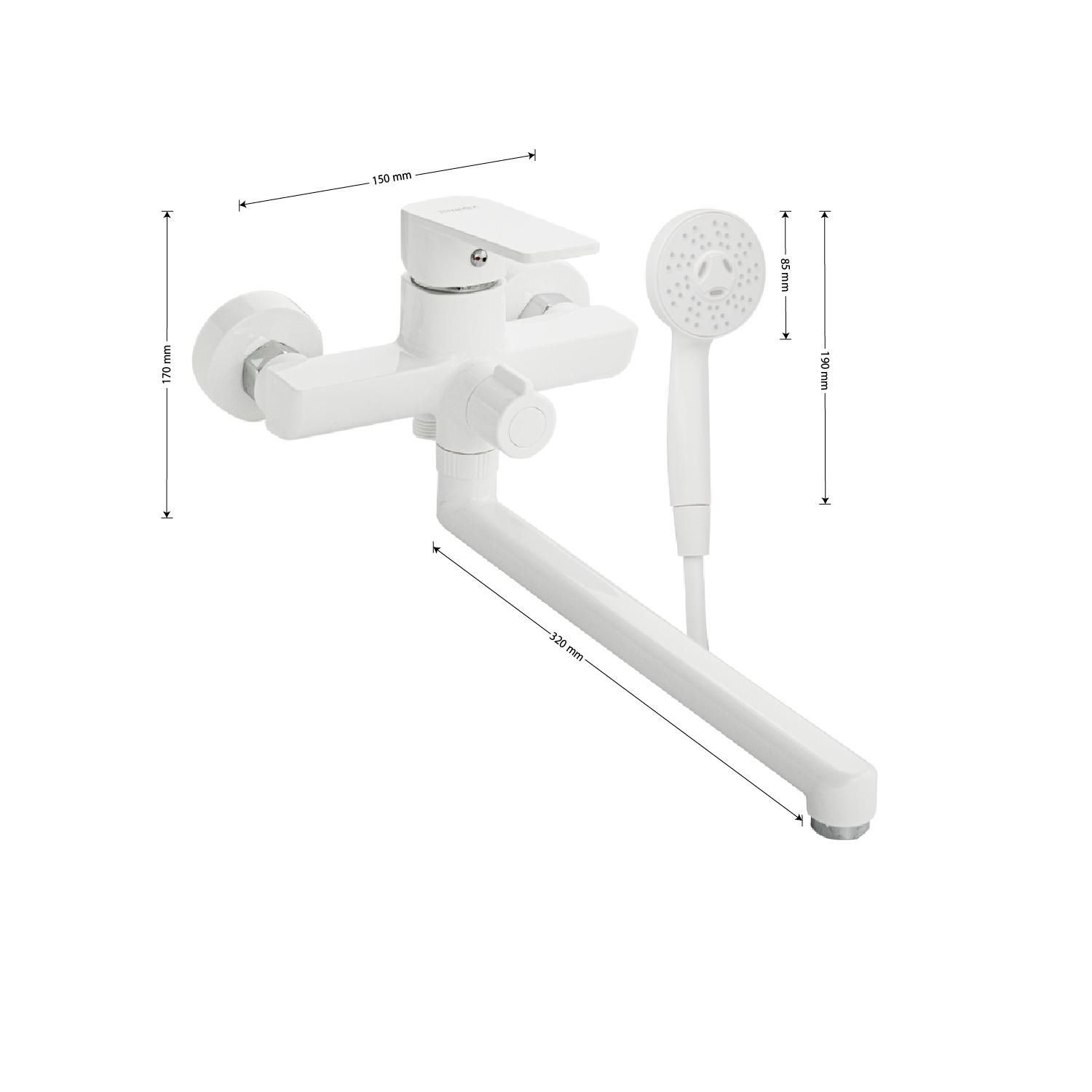 Смеситель из высокопрочного пластика АБС, БЕЛЫЙ в ванную / душевую комнату с длинным, плоским изливом, литой корпус, шаровый с дивертором м/к на корпусе. Картридж d = 40 мм, литая ручка, хромированный, аэратор для экономии воды, хромированные чашки и эксцентрики. Габаритные размеры: ширина 150 мм, высота корпуса 170 мм, длина излива 320 мм, душевая лейка d = 85 мм, шланг 150 см. Вес - кг, объём - м3. В комплекте паспорт, корпус с изливом, дивертор, душевая лейка, шланг, кронштейн, комплект крепежа и прокладок.