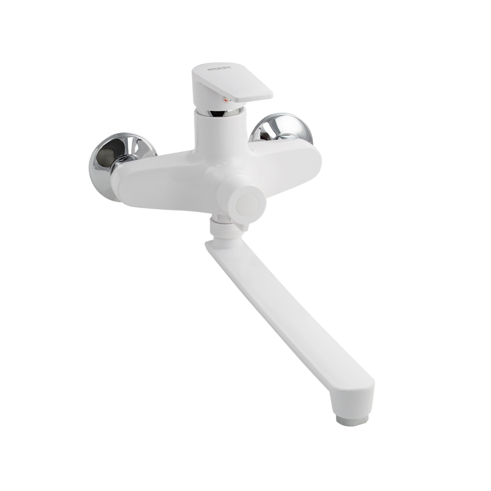 Смеситель из высокопрочного пластика АБС, БЕЛЫЙ в ванную / душевую комнату с длинным, плоским изливом, литой корпус, шаровый с дивертором м/к на корпусе. Картридж d = 40 мм, литая ручка, хромированный, аэратор для экономии воды, хромированные чашки и эксцентрики. Габаритные размеры: ширина 150 мм, высота корпуса 170 мм, длина излива 300 мм. Вес - 0,97 кг, объём - 0,00520 м3. В комплекте паспорт, корпус с изливом, комплект эксцентриков и прокладок.