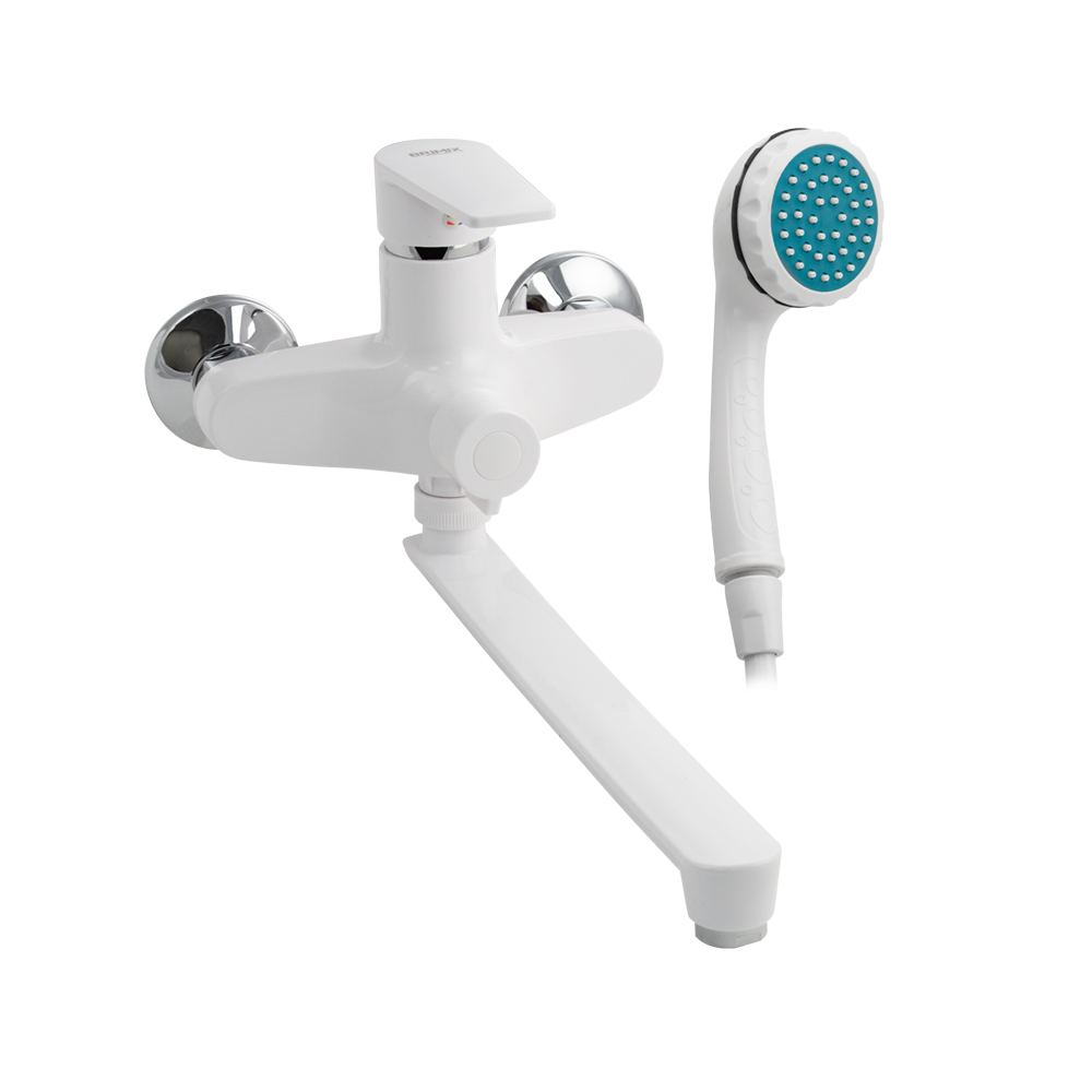 Смеситель из высокопрочного пластика АБС, БЕЛЫЙ в ванную / душевую комнату с длинным, плоским изливом, литой корпус, шаровый с дивертором м/к на корпусе. Картридж d = 40 мм, литая ручка, хромированный, аэратор для экономии воды, хромированные чашки и эксцентрики. Габаритные размеры: ширина 150 мм, высота корпуса 170 мм, длина излива 300 мм, душевая лейка d = 80 мм, шланг 150 см. Вес - 1 350 кг, объём - 0 00700 м3. В комплекте паспорт, корпус с изливом, дивертор, душевая лейка, шланг, кронштейн, комплект крепежа и прокладок.