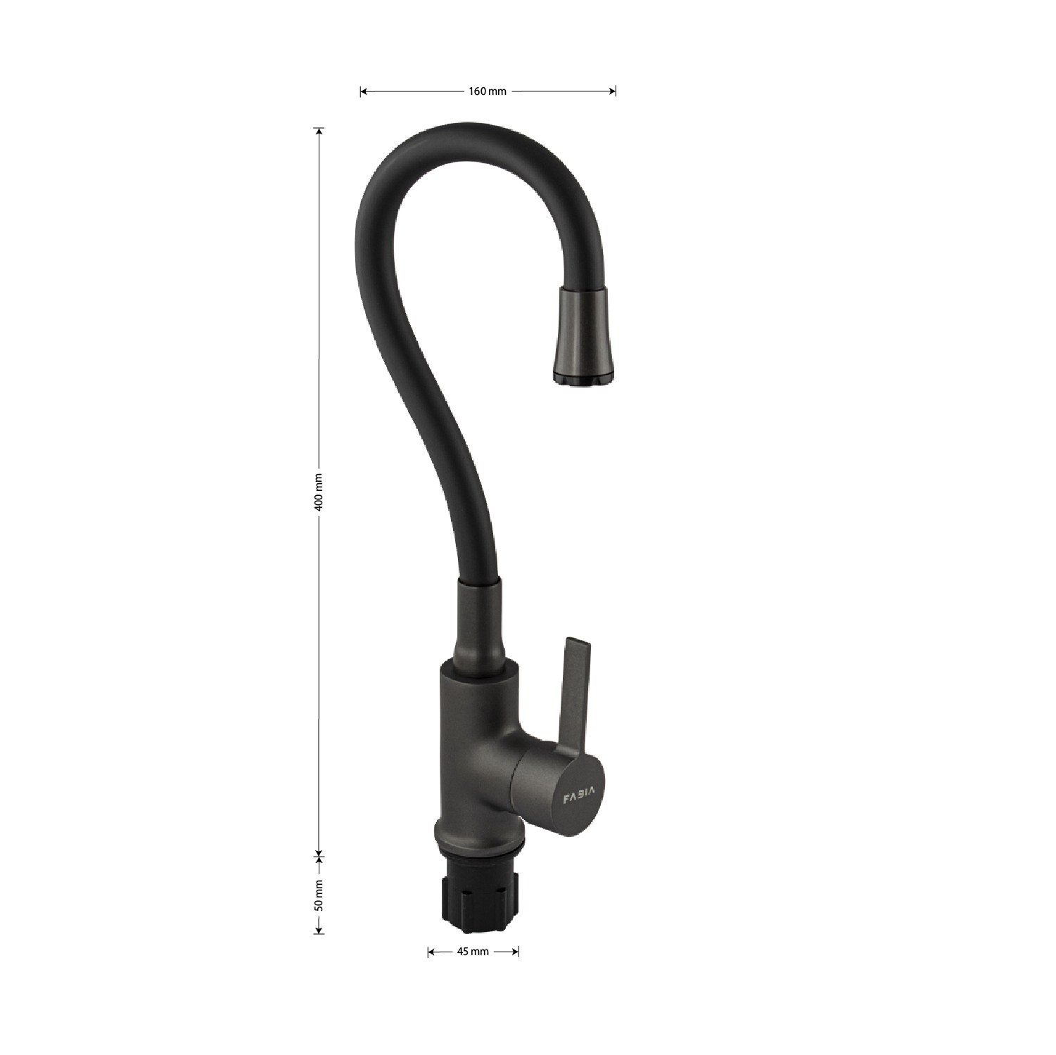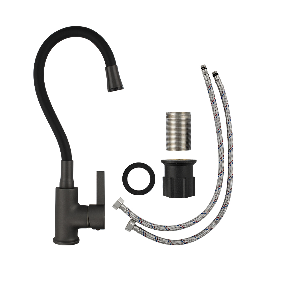 Смеситель для кухонной мойки и раковин, литой корпус цвет графит, с высоким гибким изливом черного цвета, с аэратором для экономии воды, шаровый. Материал изготовления — ЦАМ (цинк-алюминий-медь) + нержавеющая сталь. Крепление резьба - гайка, картридж d = 35 мм, ручка литая. Такая модель может использоваться на домашней кухне, на даче, в медицинских учреждениях и общественных местах. Габаритные размеры: высота 340-400 мм, длина 50-250 мм, диаметр посадочного седла 45 мм, длина резьбы 50 мм, длина подводки 400 мм. Вес - 1,350 кг, объём - 0,00403 м3. В комплекте паспорт, корпус с изливом, подводка 1/16, крепеж, набор прокладок.