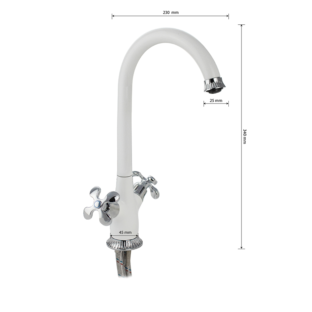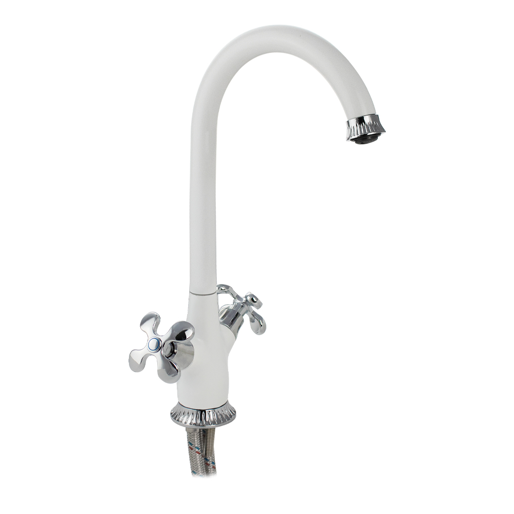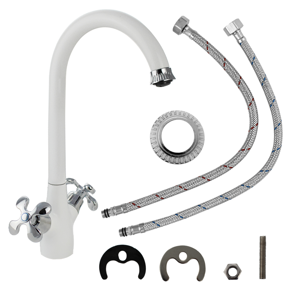 Смеситель для кухонной мойки и раковин, массивный корпус, комбинированный - белая эмаль с хромом, с высоким С-образным изливом. Материал изготовления — ЦАМ (цинк-алюминий-медь) + нержавеющая сталь. Крепление на шпильке. Декоративный аэратор для экономии воды. Кранбукса м/к 1/2, ручка крест, поворот на 90˚. Габаритные размеры: высота 340 мм, длина 230 мм, диаметр посадочного седла 45 мм, длина подводки 400 мм. Вес - 1,550 кг, объём - 0,00680 м3. В комплекте паспорт, корпус с изливом, подводка 1/2, крепеж, набор прокладок.