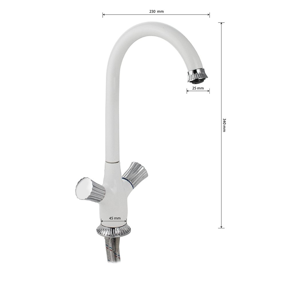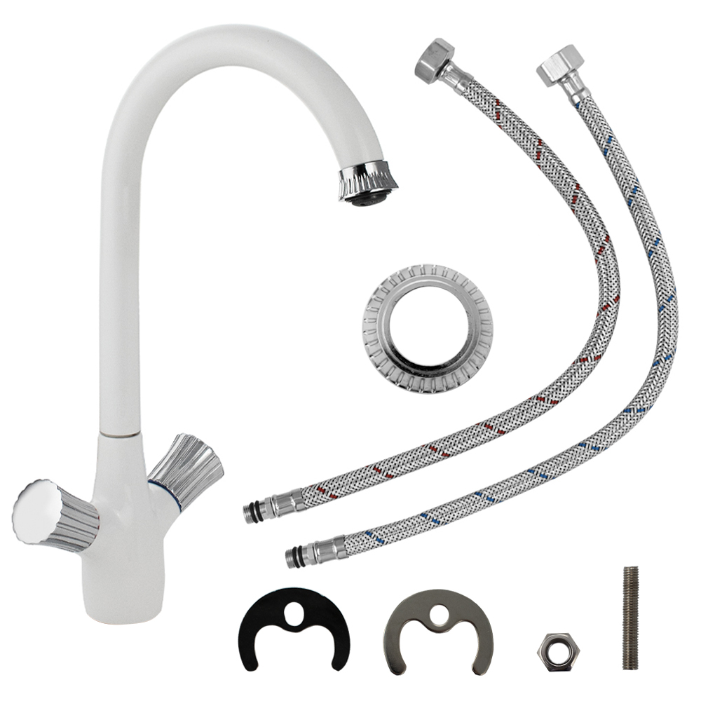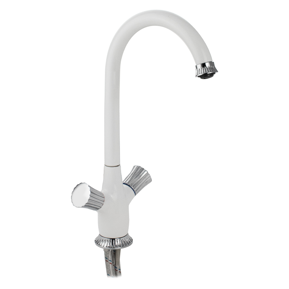 Смеситель для кухонной мойки и раковин, массивный корпус, комбинированный - белая эмаль с хромом, с высоким С-образным изливом. Крепление на шпильке. Декоративный аэратор для экономии воды. Кранбукса м/к 1/2, ручка круглая, резная, поворот на 90˚. Габаритные размеры: высота 340 мм, длина 230 мм, диаметр посадочного седла 45 мм, длина подводки 400 мм. Вес - 1,600 кг, объём - 0,00590 м3. В комплекте паспорт, корпус с изливом, подводка 1/2, крепеж, набор прокладок.