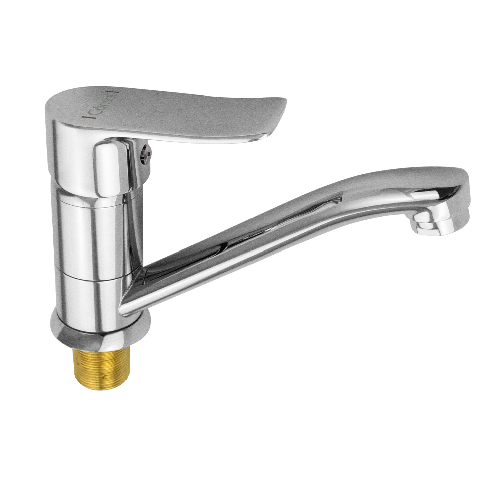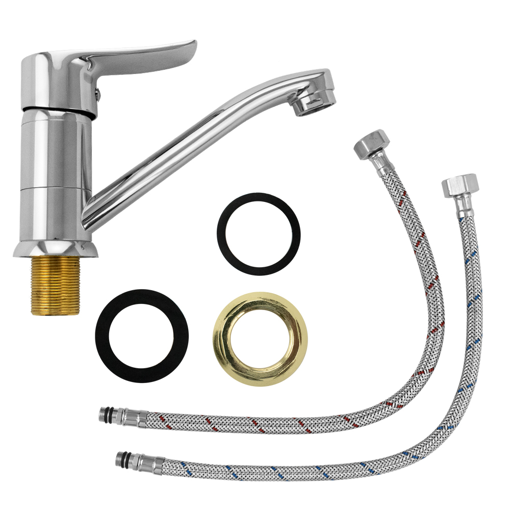 Смеситель для кухонной мойки и раковины, хромированный, с коротким, поворотным изливом, шаровый, литая ручка. Материал изготовления — ЦАМ (цинк-алюминий-медь). Крепление резьба - гайка, картридж d = 35 мм. Аэратор для экономии воды. Габаритные размеры: высота 115 мм, длина 185 мм, длина излива 150 мм, диаметр посадочного седла 45 мм, длина резьбы 30 мм, длина подводки 400 мм. Вес - 1,000 кг, объём - 0,00350 м3. В комплекте паспорт, корпус, подводка 1/2, крепеж, набор прокладок.