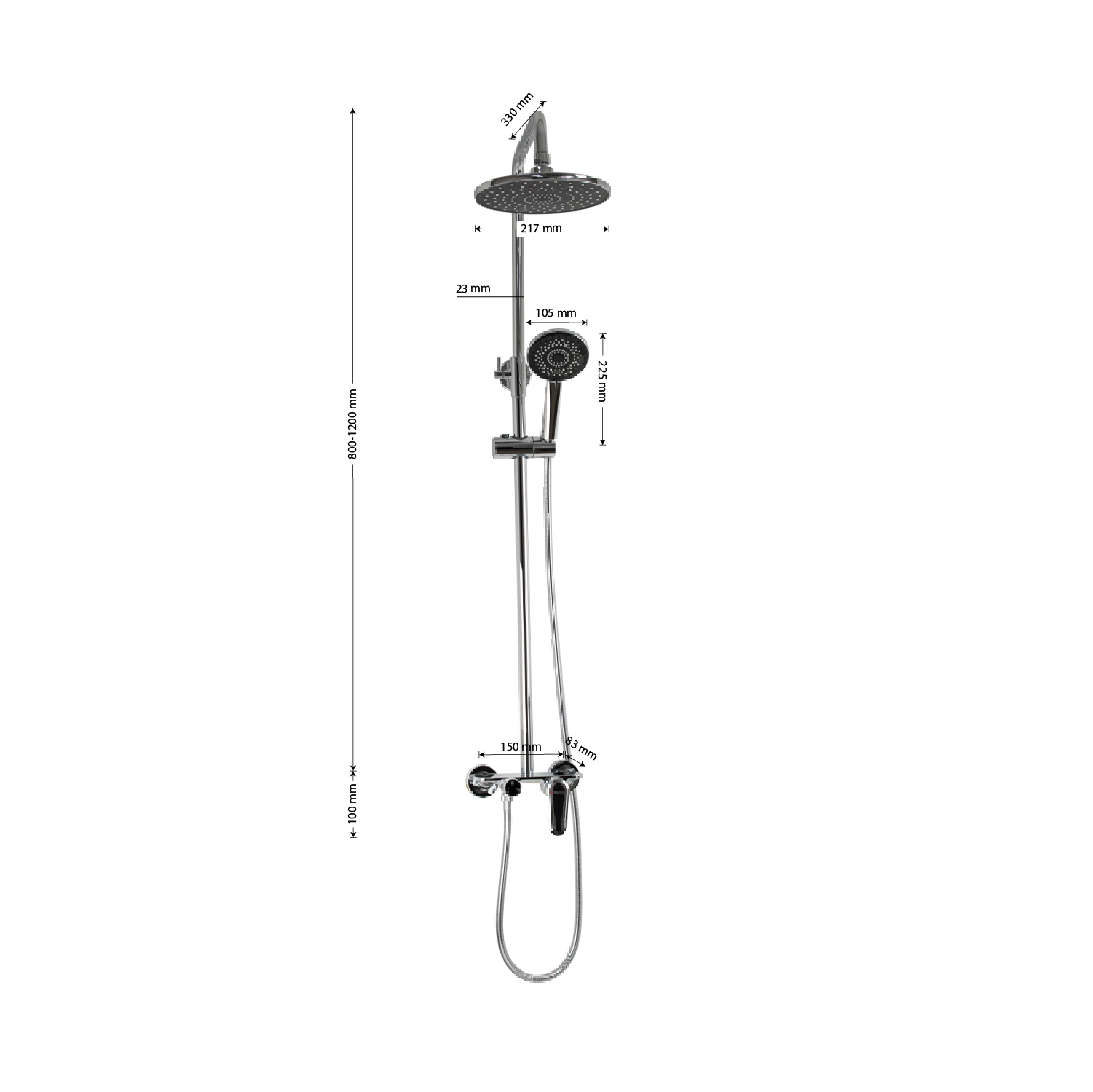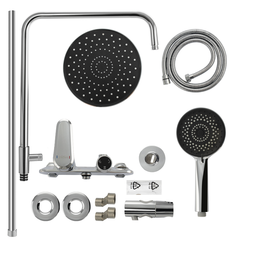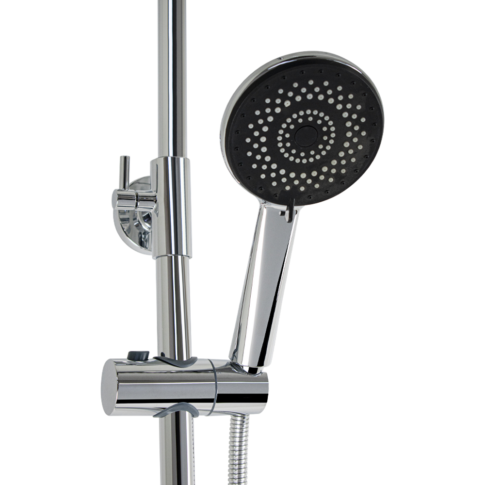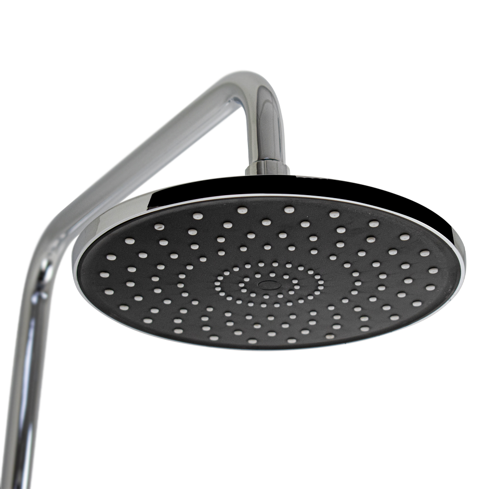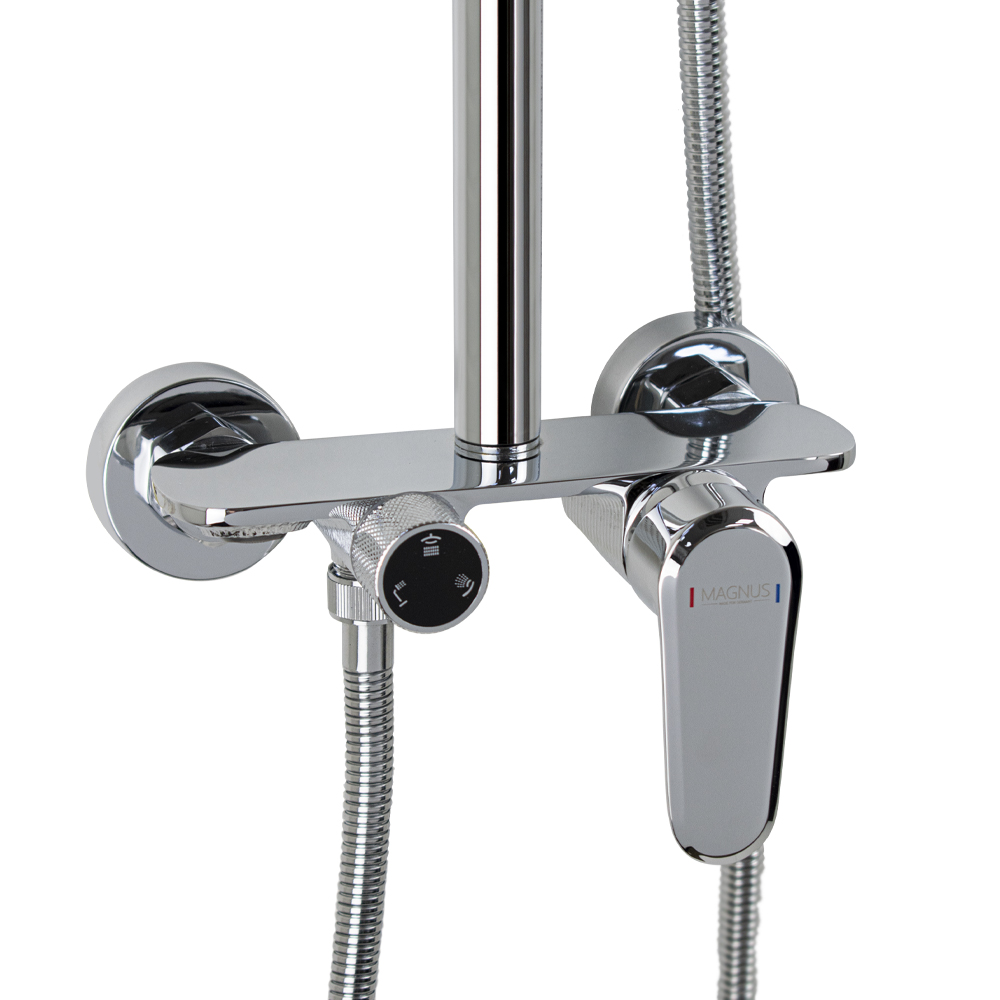 Смеситель + стойка душевая "тропический душ" с двумя лейками в ванную, хромированные. В дизайне душевой стойки гармонично соединились строгие линии и мягкие переходы. Она отлично впишется в интерьер ванной комнаты в минималистическом стиле. Глянцевое хромированное покрытие не стирается и сохраняет первозданный внешний вид в течение всего периода эксплуатации. Длительную работу без протечек обеспечивает смеситель с керамическим картриджем. Угол наклона верхнего душа можно регулировать в соответствии с потребностями каждого пользователя. Ручная лейка оснащена металлическим шлангом, который не перекручивается во время водных процедур. Смеситель с душевым шлангом и лейкой и дивертор переключения в трёх положениях. Картридж d = мм, ручка с кольцом, аэратор для экономии воды, чашки и эксцентрики. Душевая стойка с присоединением к корпусу смесителя и дополнительным креплением к стене и большой круглой лейкой с эффектом тропического душа. Габаритные размеры: ширина смесителя 150 мм, высота 100 мм, длина корпуса 83 м