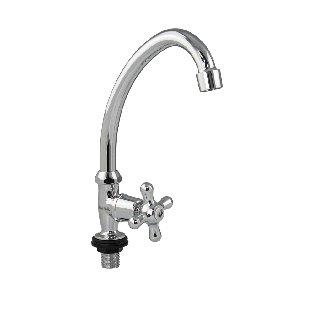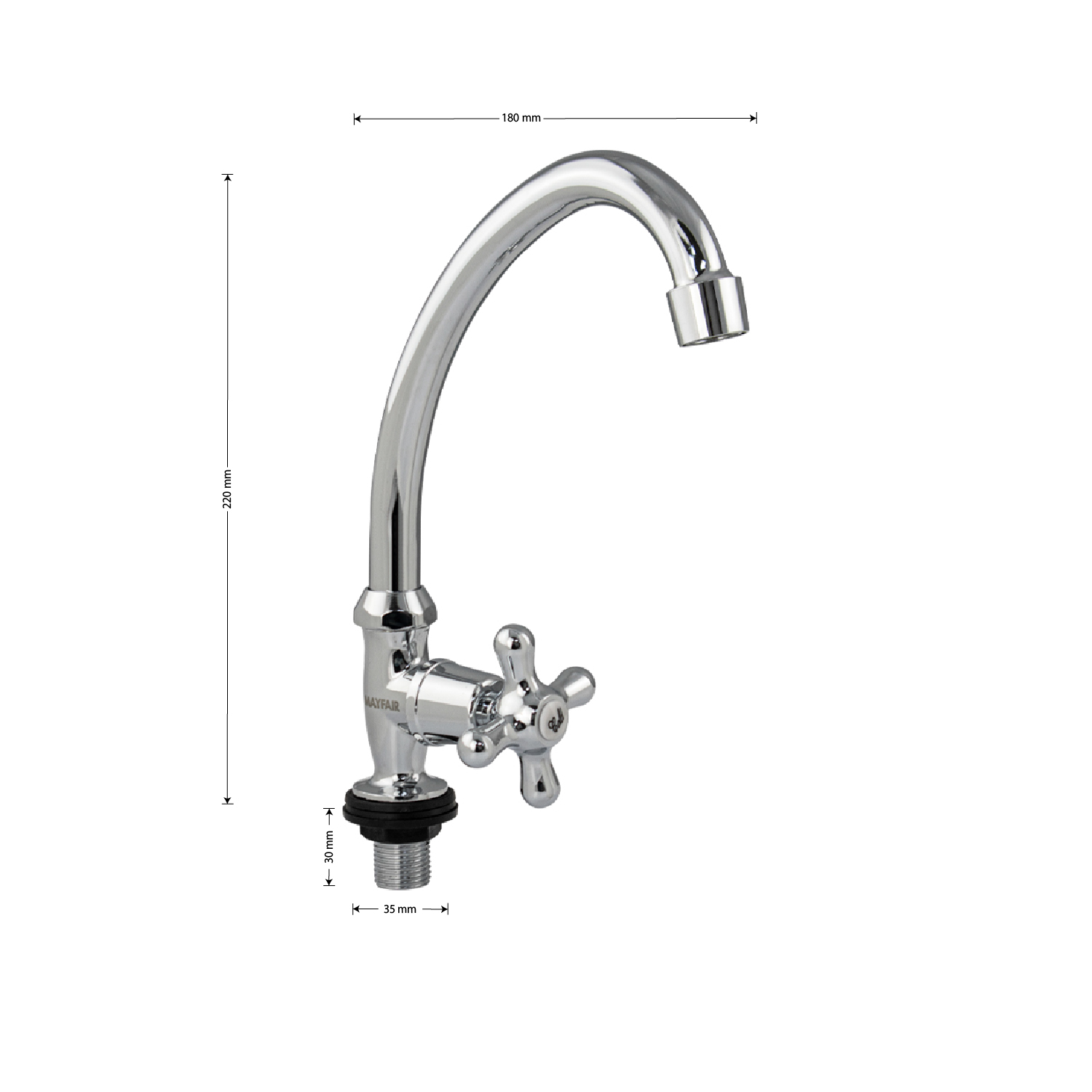 Кран на одну воду, хромированный, с аэратором для экономии воды. Материал изготовления — ЦАМ (цинк-алюминий-медь). Крепление резьба - гайка. Кранбукса м/к 1/2, ручка крест, поворот на 90˚. Габаритные размеры: высота 220 мм, длина 180 мм, диаметр посадочного седла 35 мм, длина резьбы 30 мм. Вес - 0,2400 кг, объём - 0,0009 м3. В комплекте корпус, крепёж, паспорт.