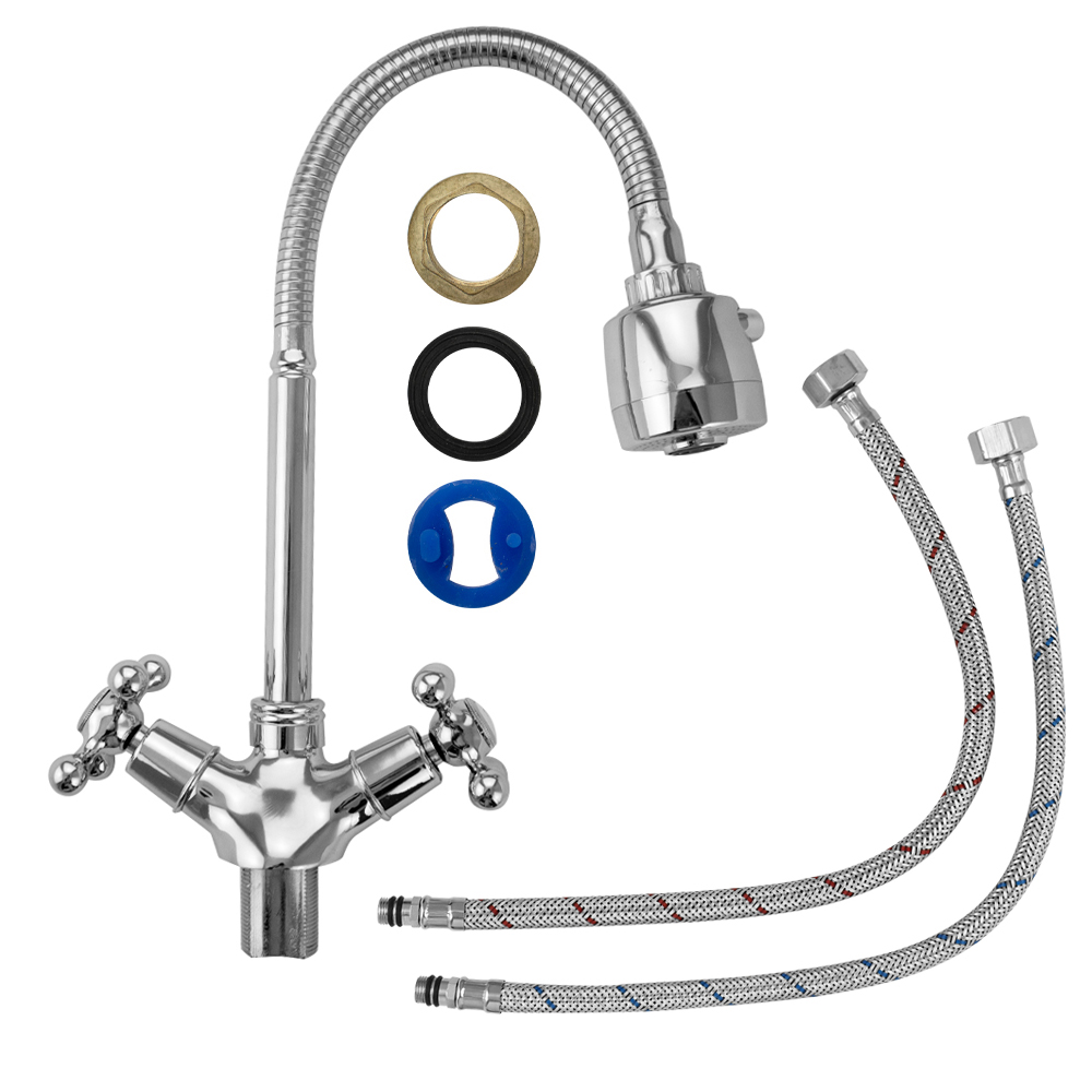 Смеситель для кухонной мойки и раковин, массивный корпус с гибким изливом, хромированный, с двухрежимным аэратором для экономии воды. Материал изготовления — ЦАМ (цинк-алюминий-медь) + нержавеющая сталь. Крепление резьба - гайка. Кранбукса м/к 1/2, ручка крест, поворот на 90˚. Габаритные размеры: высота 280 - 340 мм, длина 180 - 230 мм, диаметр посадочного седла 45 мм, длина резьбы 35 мм, длина подводки 350 мм. Вес - 1,100 кг, объём - 0,00317 м3. В комплекте корпус с изливом, паспорт, подводка 1/2, крепёж.
