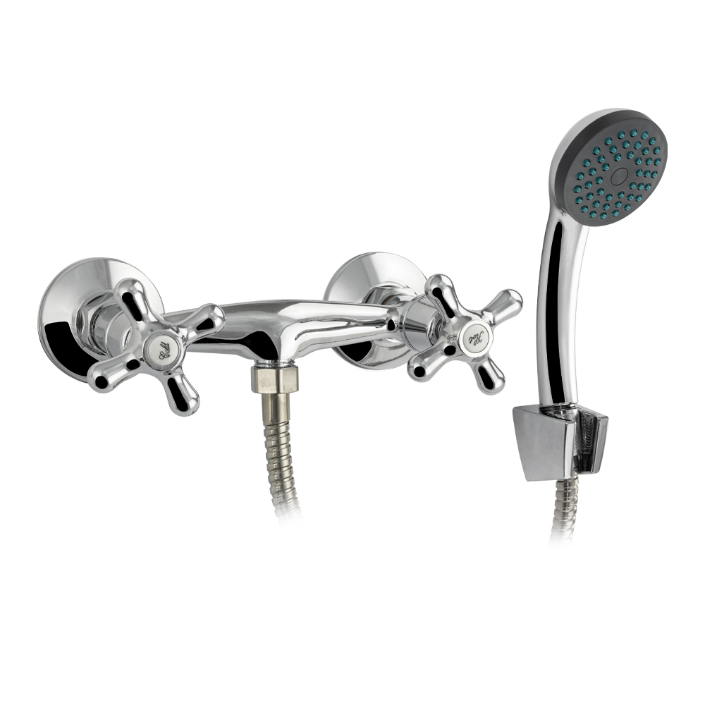 Смеситель хромированный в ванную/душевую комнату без излива. Кранбукса металокерамика 1/2, поворот на 90˚, ручка крест, крепление к стене, чашки нержавеющая сталь, гайки и эксцентрики из нержавейки, душевая лейка. Габаритные размеры: ширина 150 мм, длина 100 мм, высота 50 мм, диаметр чашки 60 мм, диаметр лейки 65 мм. Вес - 0,900 кг, объём - 0,00384 м3. В комплекте корпус, паспорт, шланг 150 см, лейка, кронштейн, крепеж.