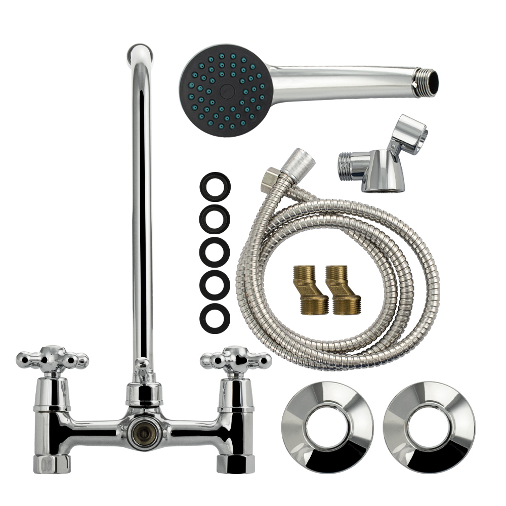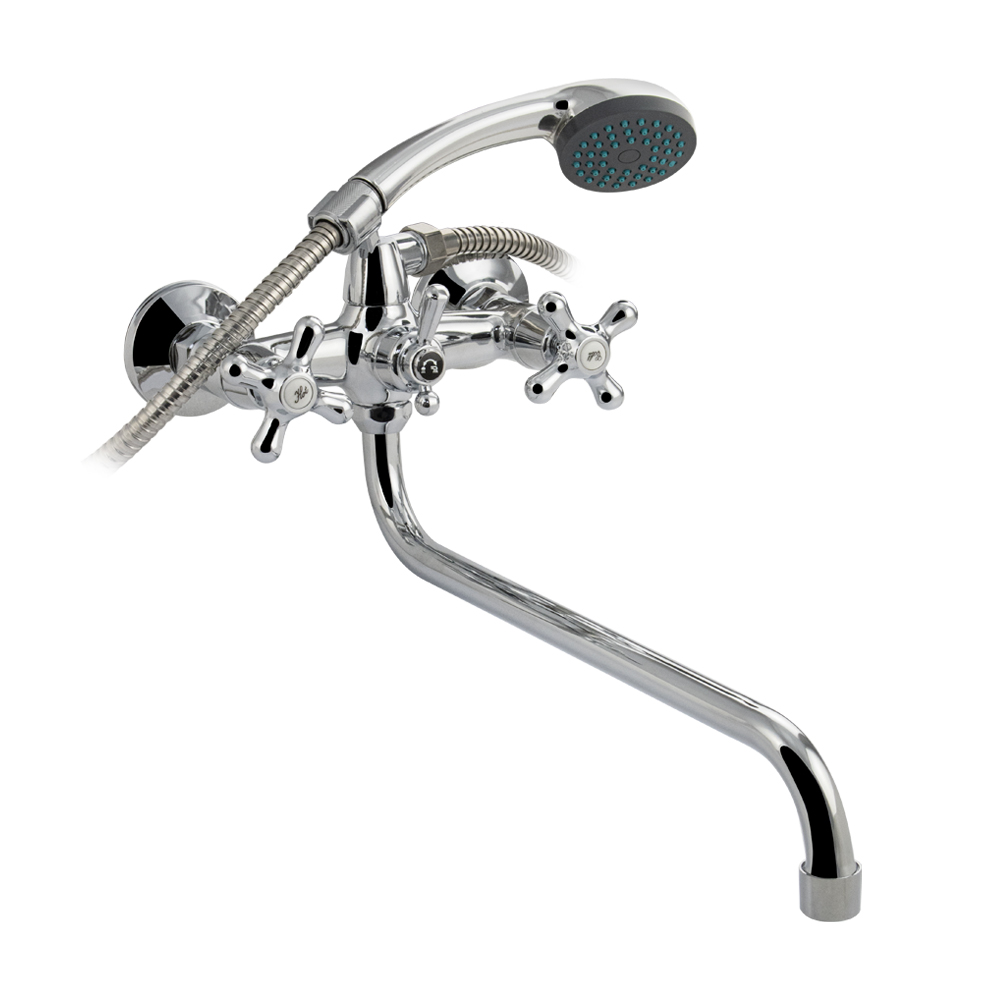 Смеситель хромированный в ванную/душевую комнату с длинным изливом. Материал изготовления — ЦАМ (цинк-алюминий-медь) + нержавеющая сталь. Кранбуксы металлокерамика 1/2, ручки крест поворот на 90˚. Дутый, большой корпус с шаровым переключением подачи воды, аэратор для экономии воды, подставка - "рога" для лейки, чашки нержавеющая сталь, гайки и эксцентрики из нержавейки. Габаритные размеры: ширина 150 мм, высота 240 мм, длина излива 350 мм, диаметр чашки 60 мм, длина шланга 150 см, лейка d = 65 мм. Вес - 1,300 кг, объём - 0,00364 м3. В комплекте корпус с изливом, паспорт, крепёж, прокладки, лейка, шланг.