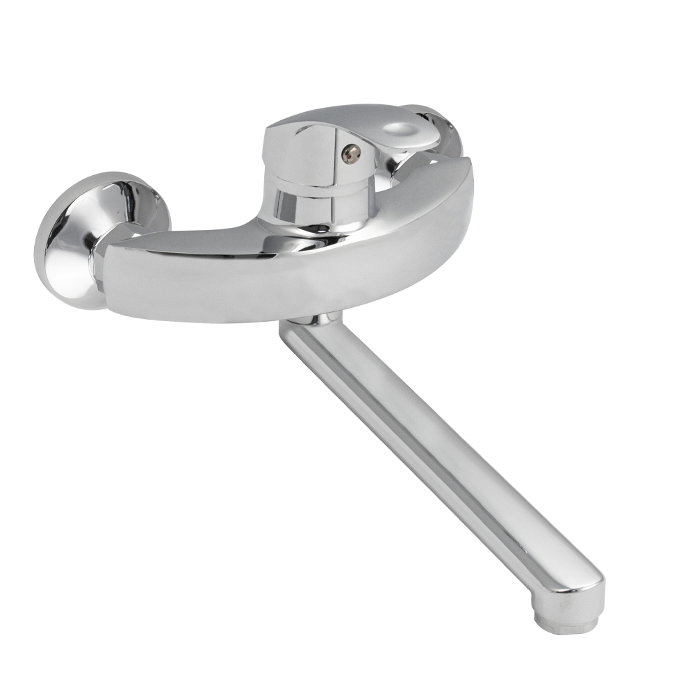 Смеситель от стены, для кухонной мойки и раковин, хромированный, изогнутый дутый корпус, шаровый, с плоским изливом, аэратором для экономии воды, картридж d = 40 мм, ручка литая. Материал изготовления — ЦАМ (цинк-алюминий-медь) + нержавеющая сталь. Габаритные размеры: ширина 150 мм, высота 120 мм, длина излива 230 мм, диаметр чашки 65 мм. Вес - 1,000 кг, объём - 0,00377 м3. В комплекте корпус с изливом, паспорт, крепёж.