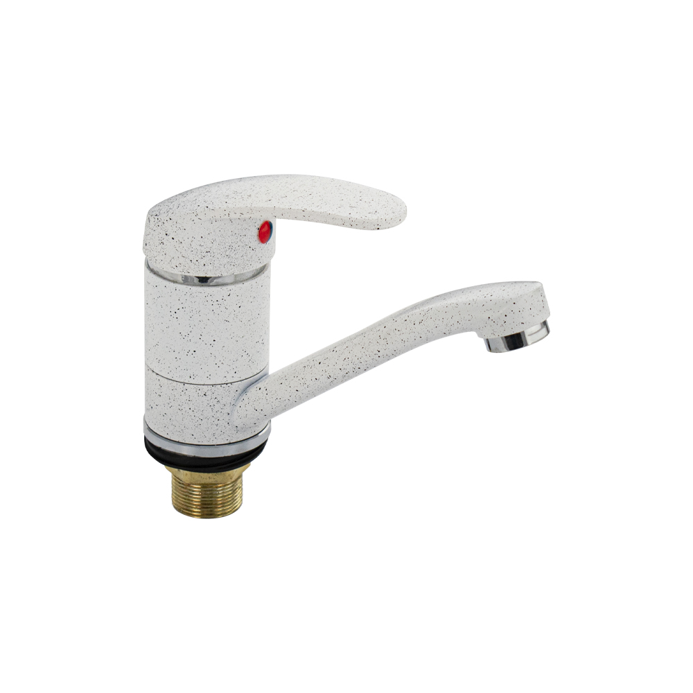 Смеситель для кухонной мойки и раковины, белый, с поворотным изливом 15 см, шаровый. Из нержавеющей стали и алюминия. Крепление резьба - гайка, картридж d = мм. Аэратор для экономии воды. Габаритные размеры: высота 110 мм, длина 165 мм, диаметр посадочного седла 50 мм, длина резьбы 45 мм, длина подводки 400 мм. Вес - 0,56 кг, объём - 0,00182 м3. В комплекте паспорт, корпус, подводка 1/2, крепеж, набор прокладок.