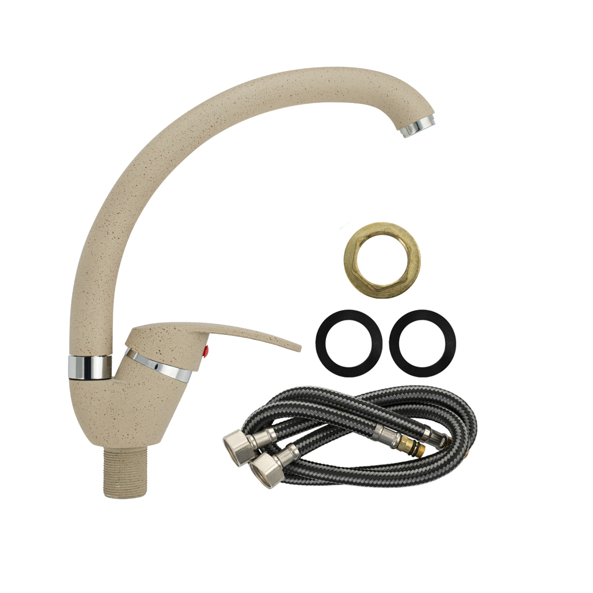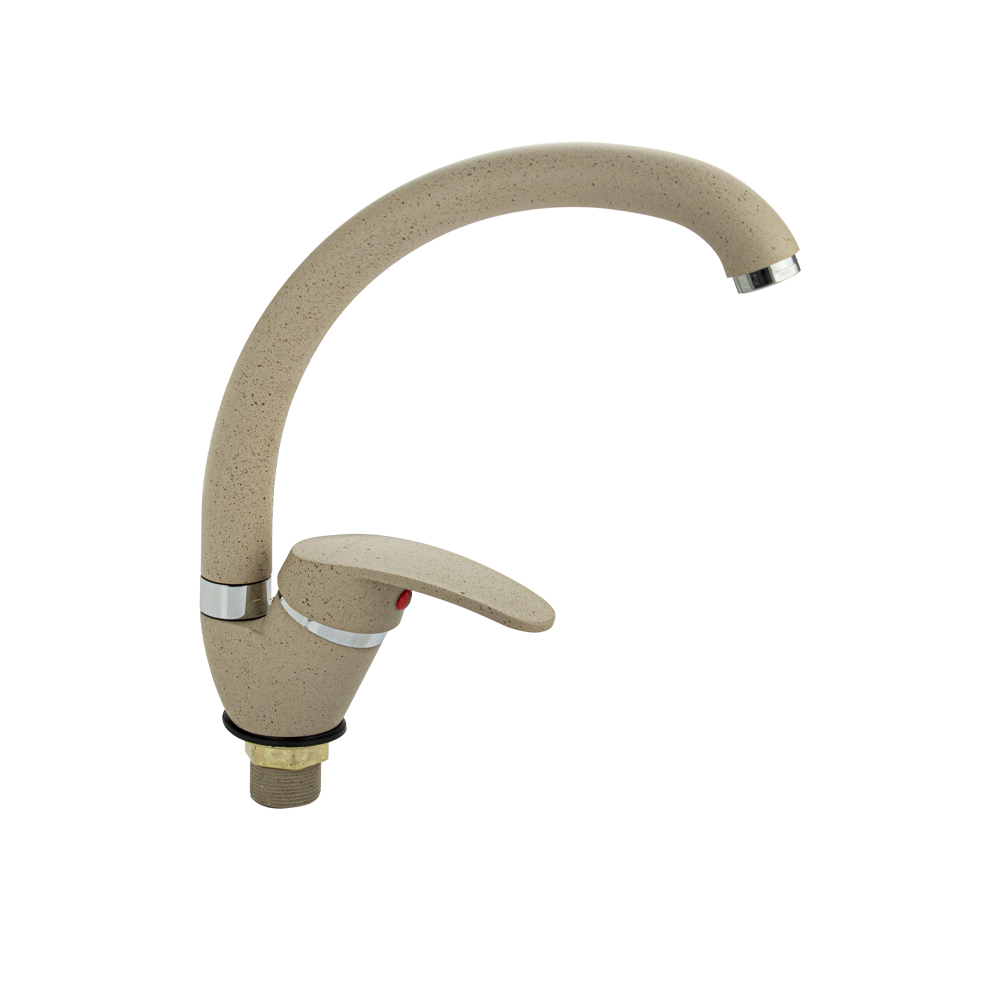 Смеситель для кухонной мойки и раковин, литой матовый корпус, из нержавеющей стали и аллюминия, с С - образным изливом, шаровый. Цвет бежевая эмаль с вкраплениями. Крепление резьба - гайка, картридж d = мм, ручка литая. Аэратор для экономии воды. Такая модель может использоваться на домашней кухне, на даче, в медицинских учреждениях и общественных местах. Габаритные размеры: высота 260 мм, длина 250 мм, диаметр посадочного седла 40 мм, длина резьбы 30 мм, длина подводки 400 мм. Вес - 0,65 кг, объём - 0,00357 м3. В комплекте паспорт, корпус с изливом, подводка 1/2, крепеж, набор прокладок.