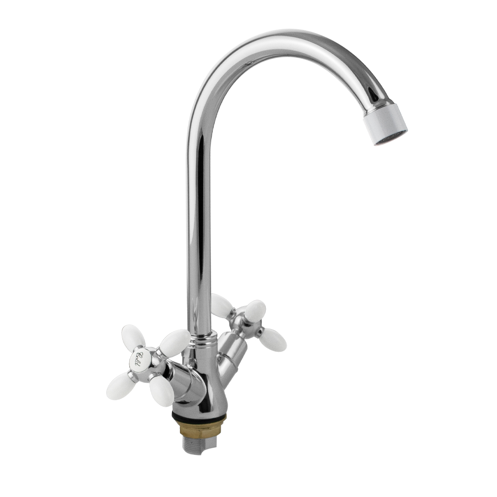 Смеситель для кухонной мойки и раковин, массивный корпус, хромированный, с высоким С-образным изливом. Материал изготовления — ЦАМ (цинк-алюминий-медь) + нержавеющая сталь. Крепление резьба - гайка. Аэратор для экономии воды. Кранбукса м/к 1/2, ручка крест, белые вставки на ручках и аэраторе, поворот на 90˚. Габаритные размеры: высота 290 мм, длина 180 мм, диаметр посадочного седла 40 мм, длина резьбы 35 мм, длина подводки 350 мм. Вес - 0,900 кг, объём - 0,00416 м3. В комплекте паспорт, корпус с изливом, подводка 1/2, крепеж, набор прокладок.