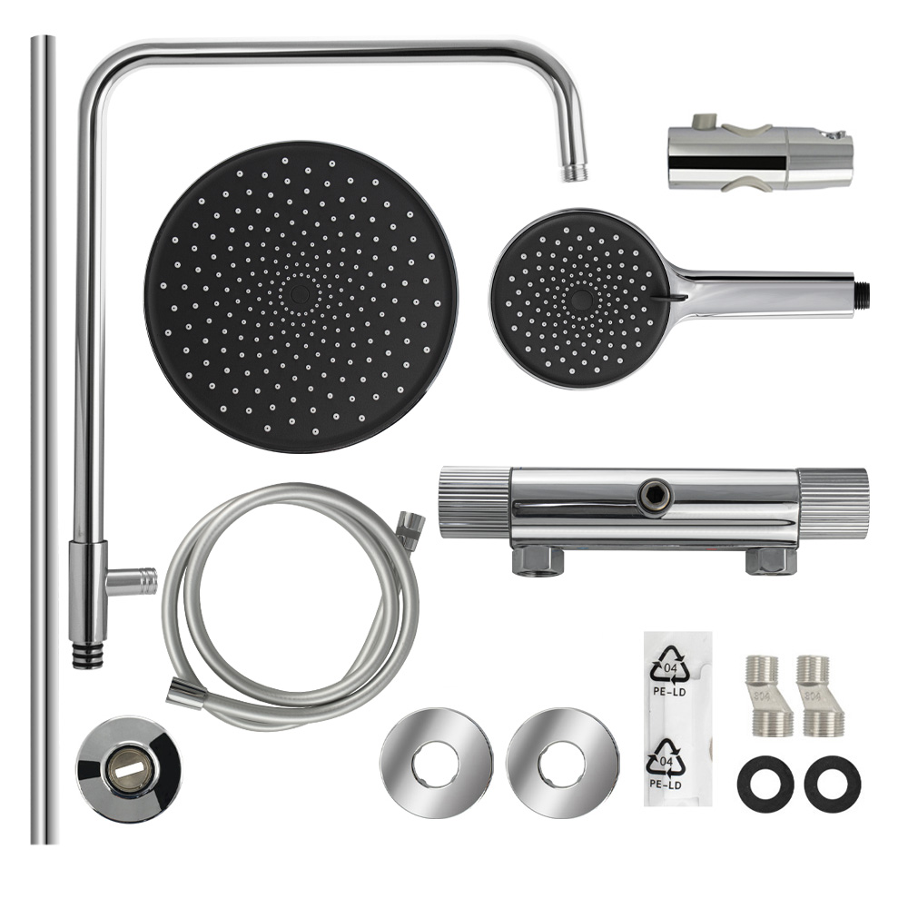 Смеситель термостатический + стойка душевая телескопическая "тропический душ" – надежное сантехническое оборудование. Хромированный круглый корпус без излива. Температура и напор воды устанавливаются поворотом двух удобных рукояток. Термостат поддерживает заданную температуру воды и может работать в системах низкого давления с газовыми проточными водонагревателями. Ограничитель температуры до 38 градусов спасает от возможного ожога при случайном повороте рукоятки. Встроенный аэратор формирует комфортный и приятный поток воды. Сеточка легко снимается для удаления налета. Аксессуар оснащен термостатическим картриджем с шумоподавлением и керамической кран-буксой, стойка с двумя хромированными лейками и хромированным шлангом. Габаритные размеры: высота стойки 800-1200 мм, длина излива стойки 360 мм, лейка для душа 130 мм двухрежимная, лейка тропического душа  255 мм, ширина смесителя 150 мм, высота смесителя 55 мм, шланг  150 см. Вес - 3.97 кг, объём - 0.02941 м3. В комплекте корпус, стойка, 2 лейки, шланг, паспо