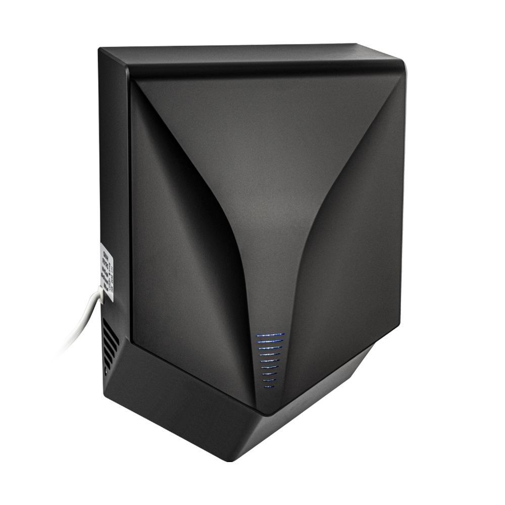 Электрическая сушилка для рук скоростная, c направленным потоком воздуха из двух плоских сопел, расположенных под углом друг к другу, цвет чёрный, с неоновой подсветкой, незаменима в местах с большой проходимостью людей (бизнес-центры, торговые центры, гостиницы, кинотеатры, рестораны). Корпус сушилки изготовлен из прочного пластика АБС чёрного цвета, который выдерживает различные механические воздействия. Прибор отличается средней мощностью и большой скоростью, что позволит использовать оборудование в различных помещениях с ограниченным электропотреблением или старой проводкой. Для удобства эксплуатации в сушилке для рук предусмотрен инфракрасный датчик движения, который включает прибор без прикосновения к нему, при поднесении рук. Сушилка оснащена надёжным и долговечным двигателем. Прибор облачён в ударопрочный корпус. Параметры - 1000Вт, автоматическая, АС 220-230В 50/60Гц, сенсор включения 50 - 150 мм, скорость потока >95 м/c, температура воздуха >40°C, влагозащищенность IPX4. В комплекте сушилка, паспо