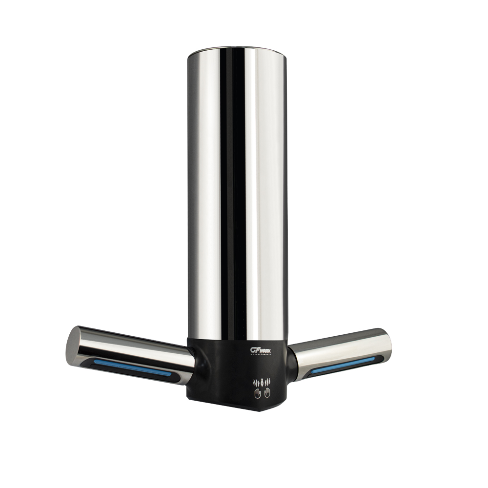 Электрическая сушилка для рук, скоростная, c направленным потоком воздуха из двух сопел, расположенных под углом, цвет хром, с неоновой подсветкой, незаменима в местах с большой проходимостью людей (бизнес-центры, торговые центры, гостиницы, кинотеатры, рестораны). Корпус сушилки изготовлен из нержавеющей стали марки SUS 304, который выдерживает различные механические воздействия. Прибор отличается средней мощностью и большой скоростью потока воздуха, что позволит использовать оборудование в различных помещениях с ограниченным электропотреблением или старой проводкой. Для удобства эксплуатации в сушилке для рук предусмотрен инфракрасный датчик движения, который включает прибор без прикосновения к нему, при поднесении рук. Сушилка оснащена надёжным и долговечным двигателем. На обратной стороне корпуса расположены кнопки ключения питания и обогрева потока воздуха. Прибор облачён в ударопрочный корпус. Параметры - 1350Вт, автоматическая, АС 220-230В, 50/60Гц, сенсор включения 50 - 150 мм, скорость потока >85 м/c