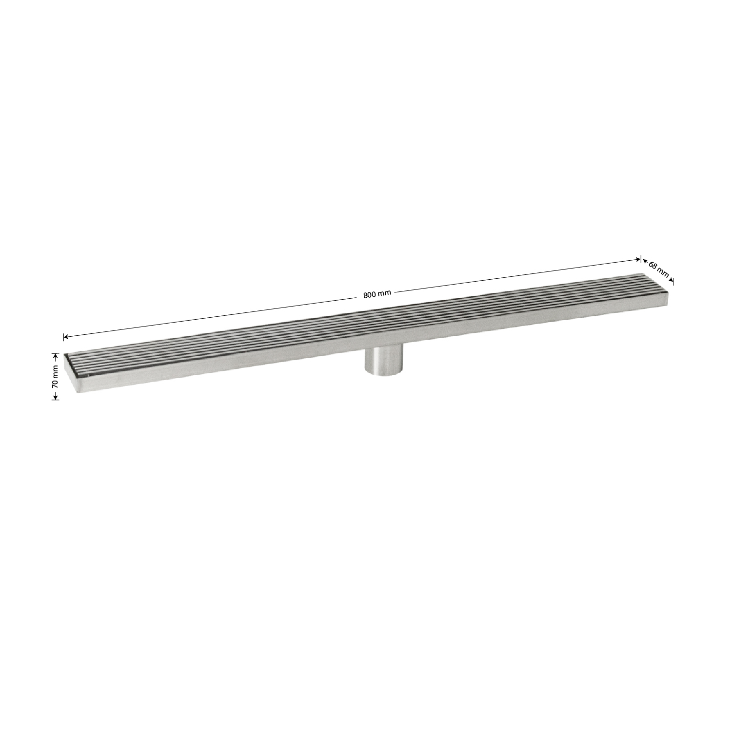 Душевой сливной трап из нержавеющей стали, матовый, линейный, вертикальный с гидрозатвором – это специальный элемент сантехнических коммуникаций, предназначенный для отвода воды в систему канализации. Как правило, душевые трапы устанавливаются непосредственно в пол. Благодаря небольшим габаритам и высоте душевые трапы идеальны для установки в душевых зонах. Это важно для организации пространства, где нет возможности установить классическую ванну: в малогабаритных квартирах, студиях, совмещенных санузлах и т.п. Габаритные размеры: высота 70 мм, ширина 68 мм, длина 800 мм, выход в канализацию 50 мм. Вес - 2,100 кг, объём - 0,00600 м3.