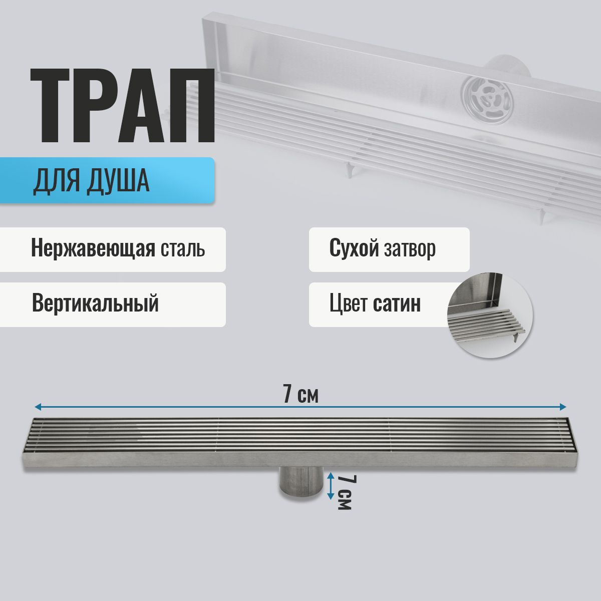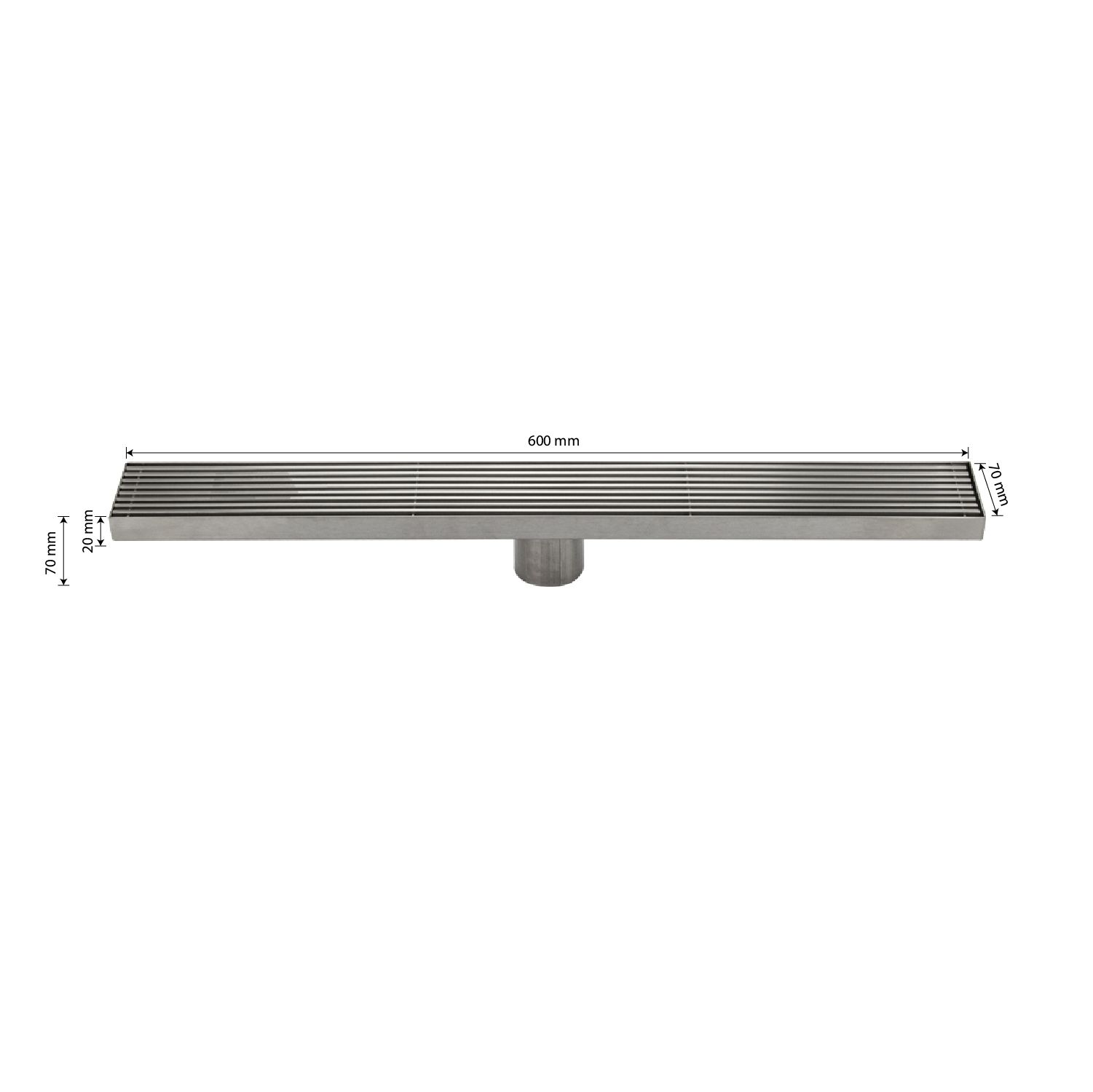 Душевой сливной трап из нержавеющей стали, линейный, вертикальный с гидрозатвором крышка решётка – это специальный элемент сантехнических коммуникаций, предназначенный для отвода воды в систему канализации. Как правило, душевые трапы устанавливаются непосредственно в пол. Благодаря небольшим габаритам и высоте душевые трапы идеальны для установки в душевых зонах. Это важно для организации пространства, где нет возможности установить классическую ванну: в малогабаритных квартирах, студиях, совмещенных санузлах и т.п. Габаритные размеры: высота 70 мм, ширина 70 мм, длина 600 мм, выход в канализацию 50 мм. Вес - 1,600 кг, объём - 0,00400 м3.
