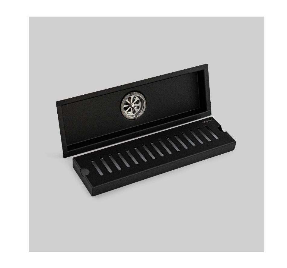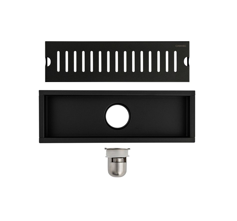 Трап линейный 300 х 100 мм, вертикальный выпуск с гидрозатвором, с верхним бортиком, из нержавеющей стали марки SUS 304, цвет ЧЁРНЫЙ.