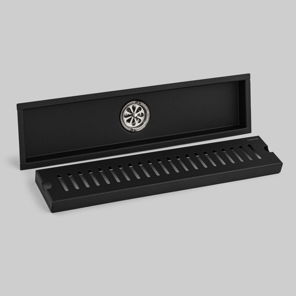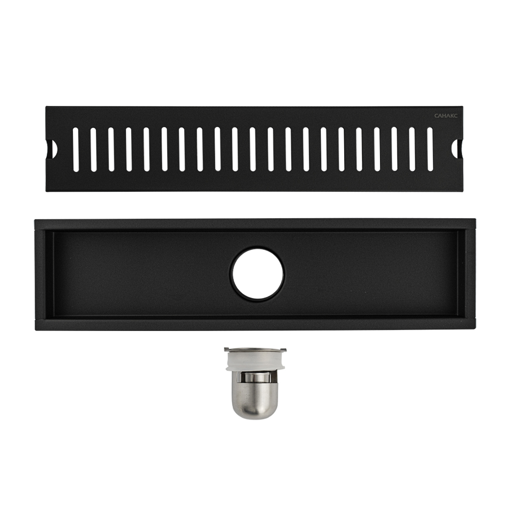 Трап линейный 400 х 100 мм, вертикальный выпуск с гидрозатвором, с верхним бортиком, из нержавеющей стали марки SUS 304, цвет ЧЁРНЫЙ.