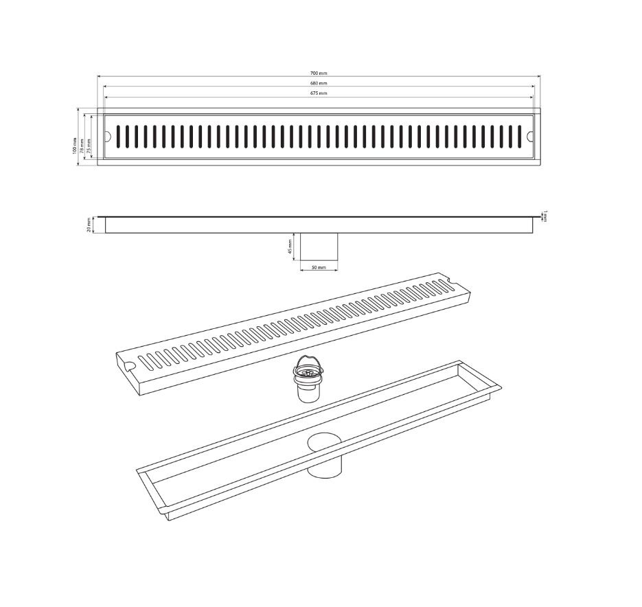 Душевой сливной трап из нержавеющей стали, линейный, вертикальный с гидрозатвором – это специальный элемент сантехнических коммуникаций, предназначенный для отвода воды в систему канализации. Как правило, душевые трапы устанавливаются непосредственно в пол. Благодаря небольшим габаритам и высоте душевые трапы идеальны для установки в душевых зонах. Это важно для организации пространства, где нет возможности установить классическую ванну: в малогабаритных квартирах, студиях, совмещенных санузлах и т.п. Габаритные размеры: высота 70 мм, ширина 100 мм, длина 700 мм, выход в канализацию 50 мм. Вес - 1.3 кг, объём - 0.00624 м3.