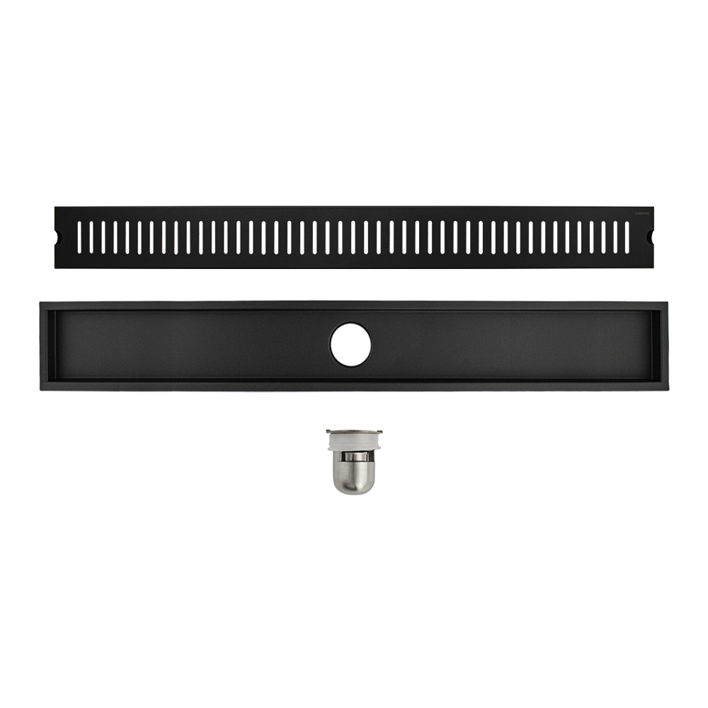 Трап линейный 800 х 100 мм, вертикальный выпуск с гидрозатвором, с верхним бортиком, из нержавеющей стали марки SUS 304, цвет ЧЁРНЫЙ.