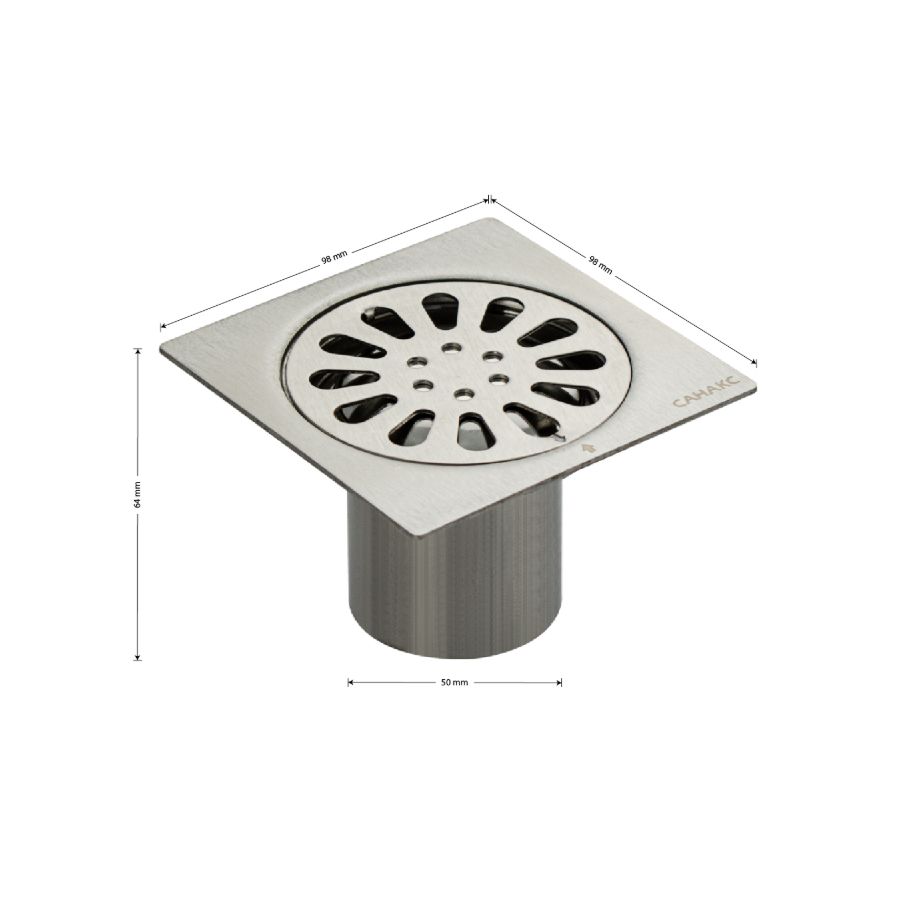 Душевой сливной трап из нержавеющей стали, вертикальный с гидрозатвором – это специальный элемент сантехнических коммуникаций, предназначенный для отвода воды в систему канализации. Как правило, душевые трапы устанавливаются непосредственно в пол. Благодаря небольшим габаритам и высоте душевые трапы идеальны для установки в душевых зонах. Это важно для организации пространства, где нет возможности установить классическую ванну: в малогабаритных квартирах, студиях, совмещенных санузлах и т.п. Габаритные размеры: высота 64 мм, ширина 98 мм, длина 98 мм, выход в канализацию 50 мм. Вес - 0,25 кг, объём - 0,00112 м3.