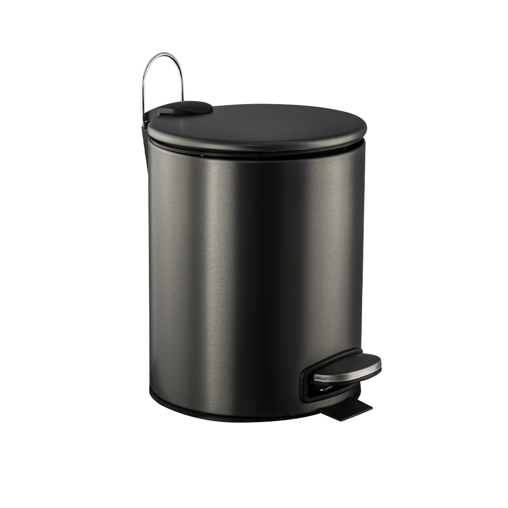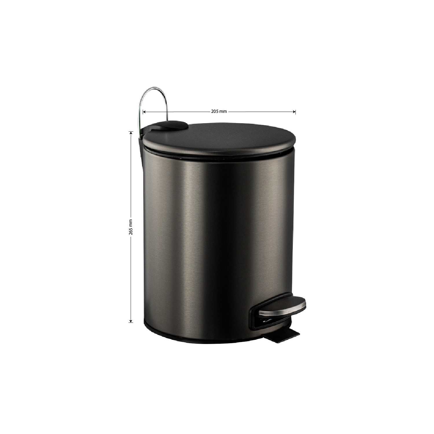 Ведро для мусора с педалью и откидной крышкой с функцией микролифт, прекрасно подойдет для ванной комнаты, туалета или кухни и офиса. Нержавеющая сталь SUS 410. Ведро оснащено пластиковым гигиеническим контейнером и плавным механизмом поднятия - опускание крышки, при помощи нажатия на педаль. Объём ведра 5 литров. Отличное решение для утилизации мелкого бытового мусора. Наличие крышки обеспечивает защиту от неприятных запахов и распространения бактерий, а педальная система открывания позволяет не прикасаться к баку руками. Благодаря современному дизайну ведро впишется в интерьер любой кухни и ванной комнаты. Преимущества ведра для мусора с педалью: удобно устанавливается и перемещается на любое место; изготовлено из устойчивой к коррозии нержавеющей стали с покрытием цвета графит; пользоваться изделием удобно и гигиенично благодаря педали в нижней части корпуса. Нескользящая пластиковая основа ведра предотвращает повреждение пола. Габаритные размеры: высота 265 мм, диаметр 205 мм. Вес - 0.9 кг, объём - 0,0135