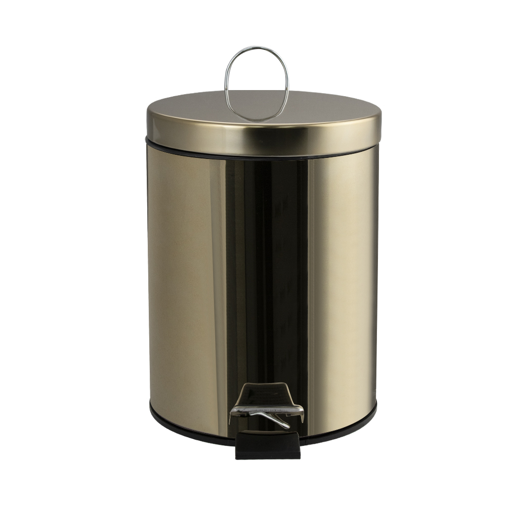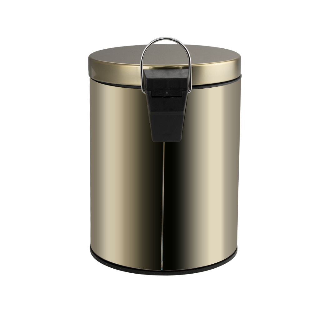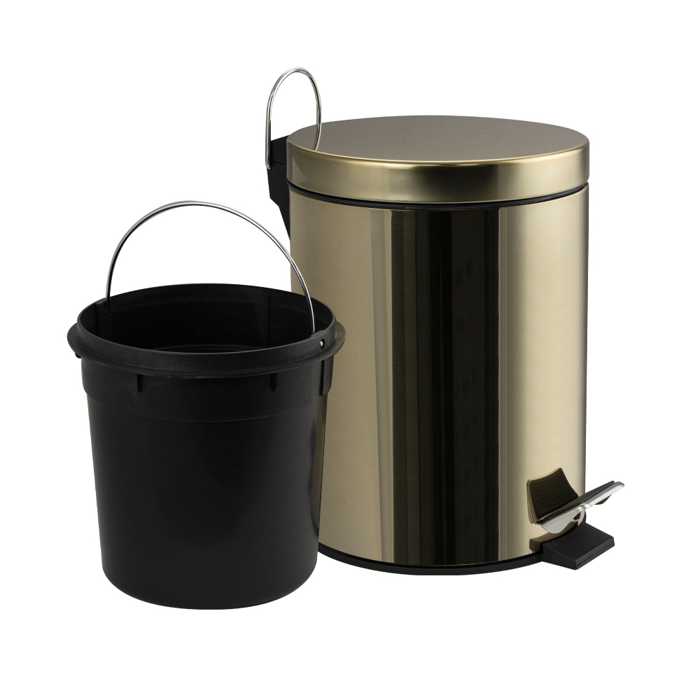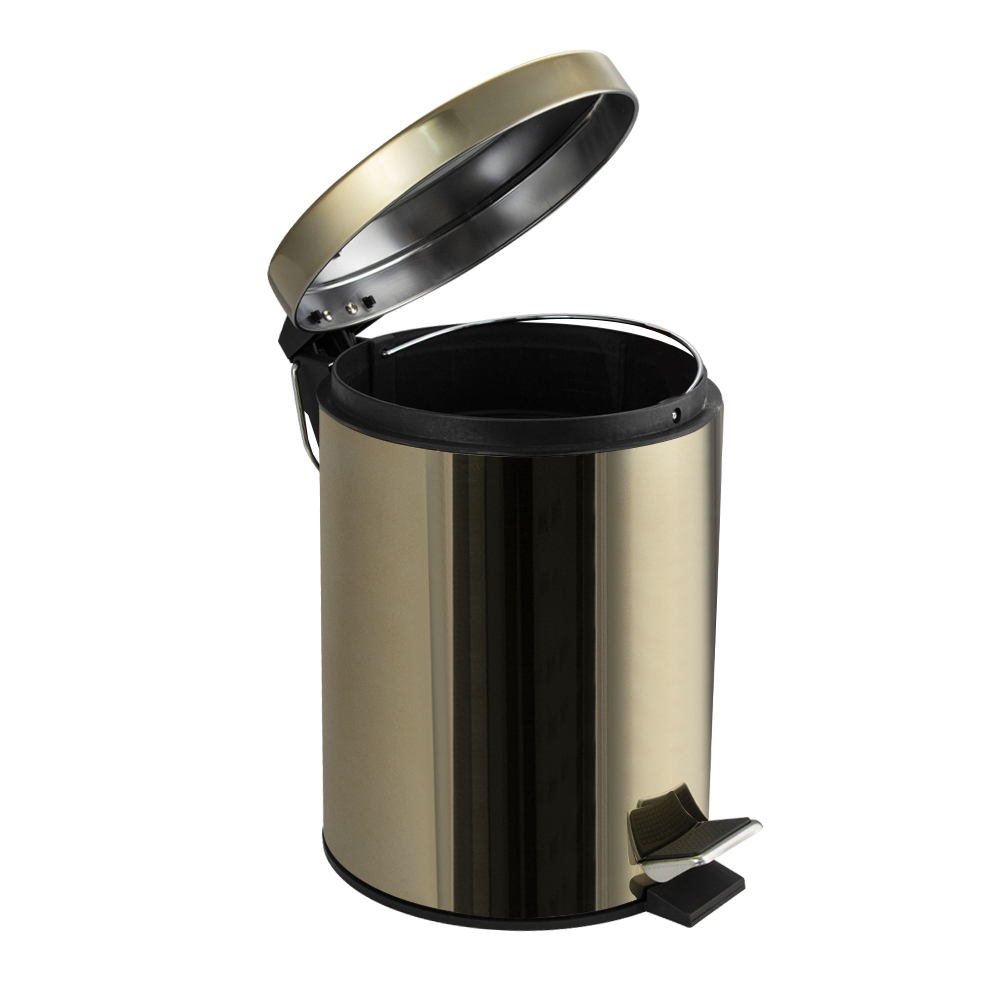 Круглое ведро, цвет бронза, для хранения мусора с педалью и откидной крышкой прекрасно подойдет для ванной комнаты, туалета или кухни и офиса. Ведро оснащено пластиковым гигиеническим контейнером с металлической ручкой для переноса и механизмом поднятия крышки, при помощи нажатия на педаль. Объём ведра 5 литров. Отличное решение для утилизации мелкого бытового мусора. Наличие крышки обеспечивает защиту от неприятных запахов и распространения бактерий, а педальная система открывания позволяет не прикасаться к баку руками. Благодаря современному дизайну ведро впишется в интерьер любой кухни и ванной комнаты. Преимущества ведра для мусора с педалью: удобно устанавливается и перемещается на любое место; изготовлено из устойчивой к коррозии нержавеющей стали с покрытием под состаренную бронзу, глянцевое; пользоваться изделием удобно и гигиенично благодаря педали в нижней части корпуса. Нескользящая пластиковая основа ведра предотвращает повреждение пола. Габаритные размеры: высота 280 мм, диаметр 205 мм. Вес - 1,