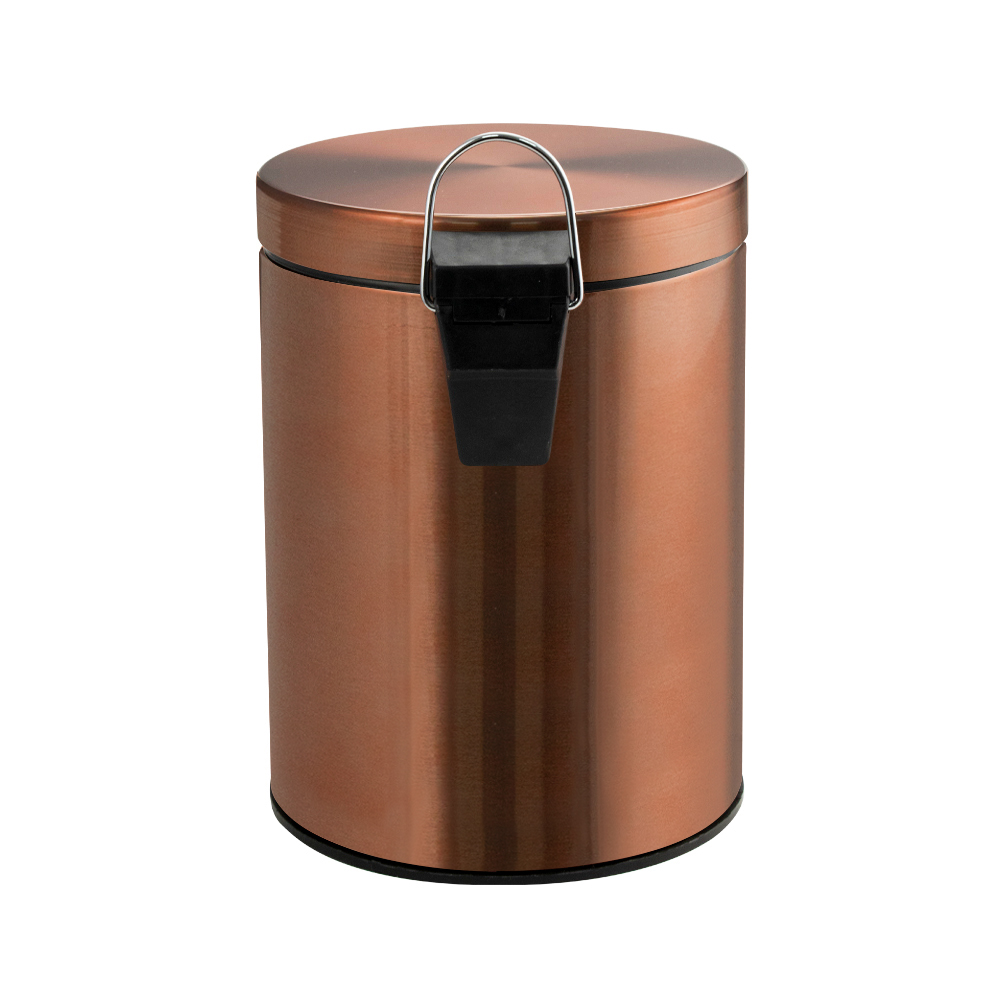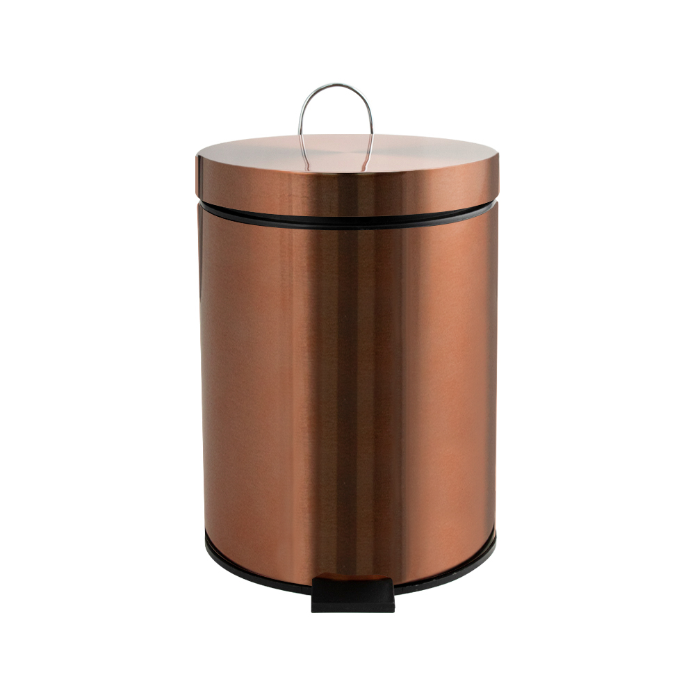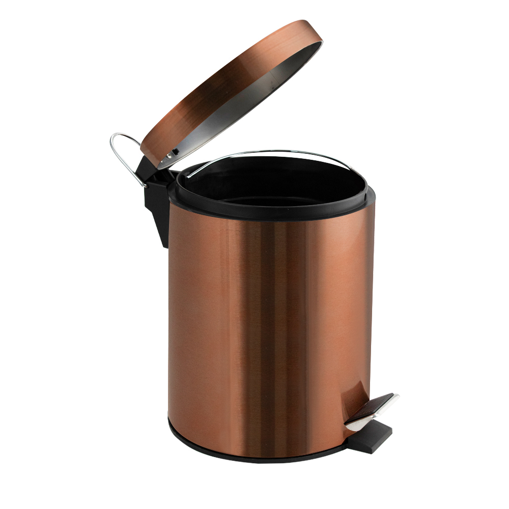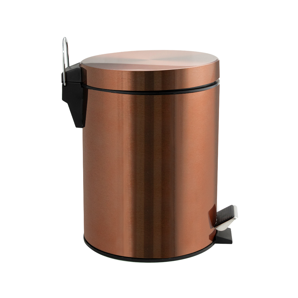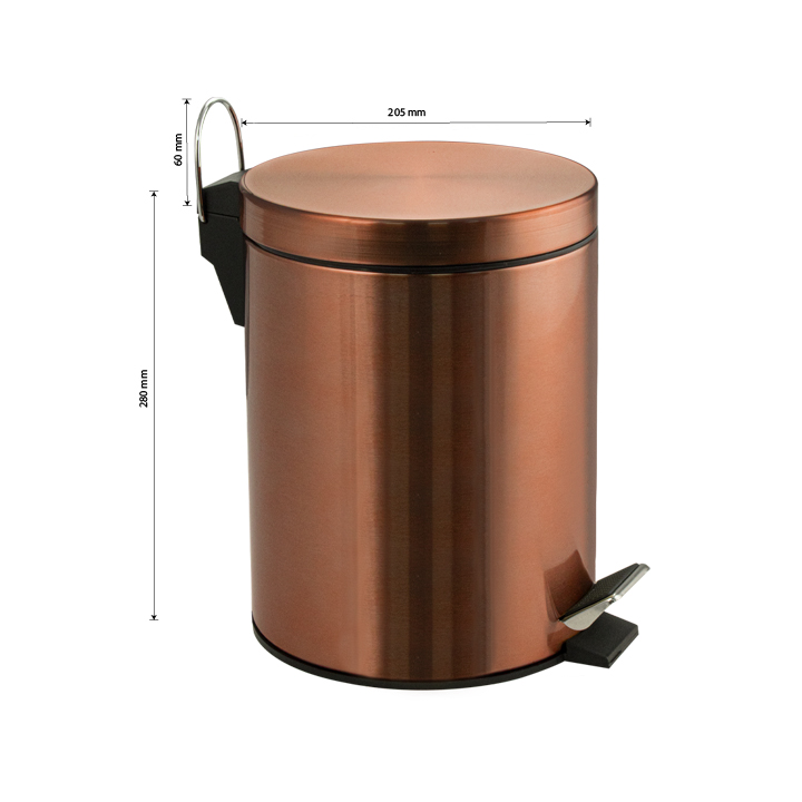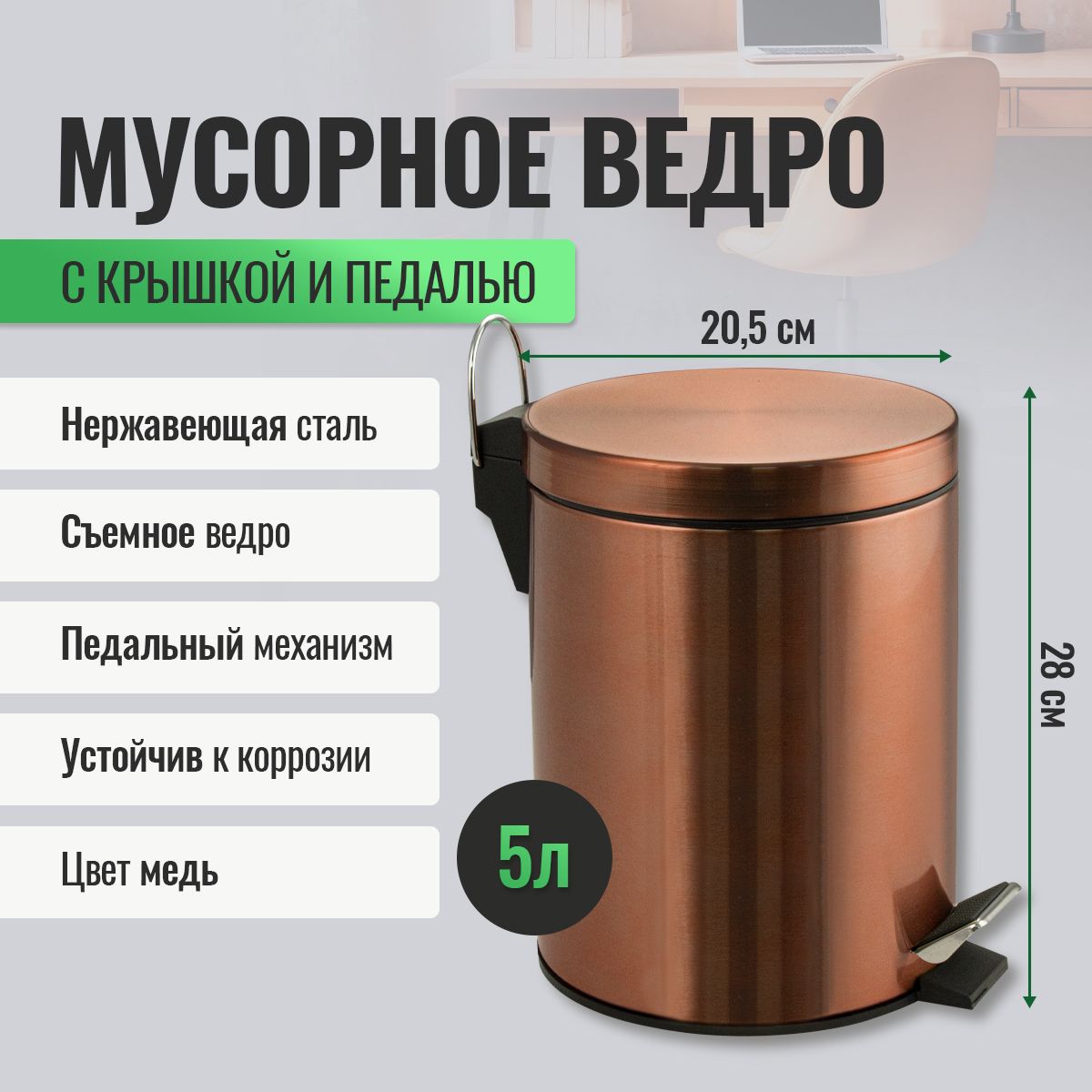 Круглое ведро, цвета медь, для хранения мусора с педалью и откидной крышкой прекрасно подойдет для ванной комнаты, туалета или кухни и офиса. Ведро оснащено пластиковым гигиеническим контейнером с металлической ручкой для переноса и механизмом поднятия крышки, при помощи нажатия на педаль. Объём ведра 5 литров. Отличное решение для утилизации мелкого бытового мусора. Наличие крышки обеспечивает защиту от неприятных запахов и распространения бактерий, а педальная система открывания позволяет не прикасаться к баку руками. Благодаря современному дизайну ведро впишется в интерьер любой кухни и ванной комнаты. Преимущества ведра для мусора с педалью: удобно устанавливается и перемещается на любое место; изготовлено из устойчивой к коррозии нержавеющей стали с покрытием под мед, глянцевое; пользоваться изделием удобно и гигиенично благодаря педали в нижней части корпуса. Нескользящая пластиковая основа ведра предотвращает повреждение пола. Габаритные размеры: высота 280 мм, диаметр 205 мм. Вес - 1,000 кг, объём -