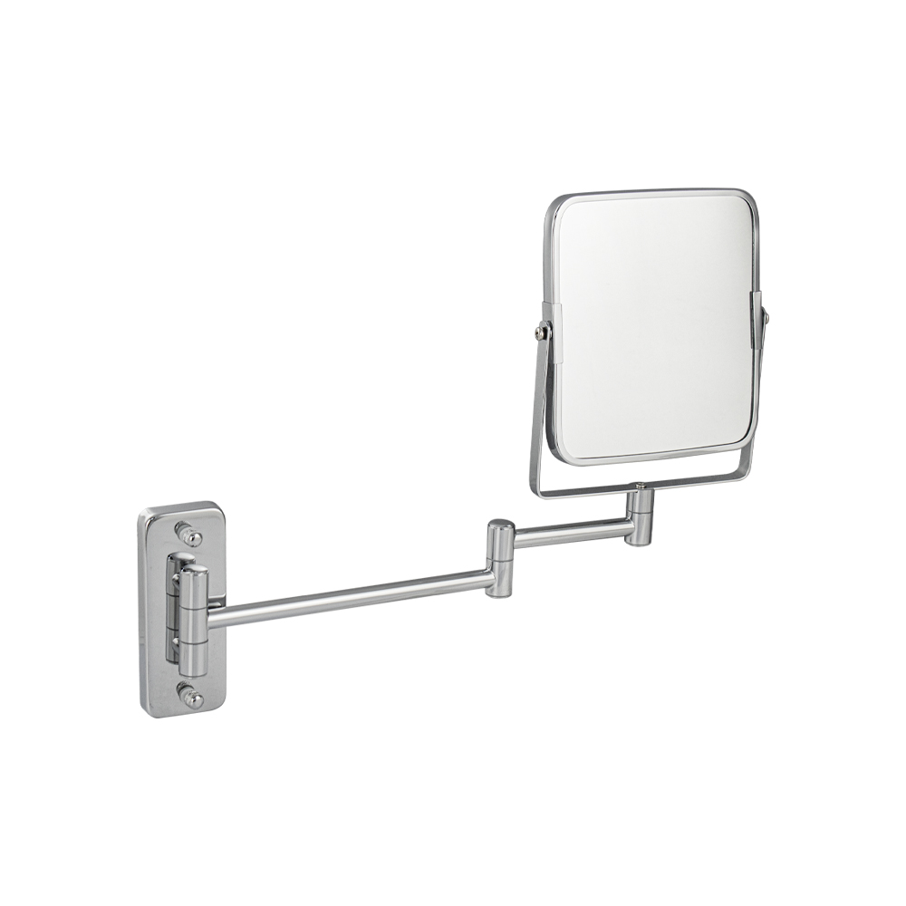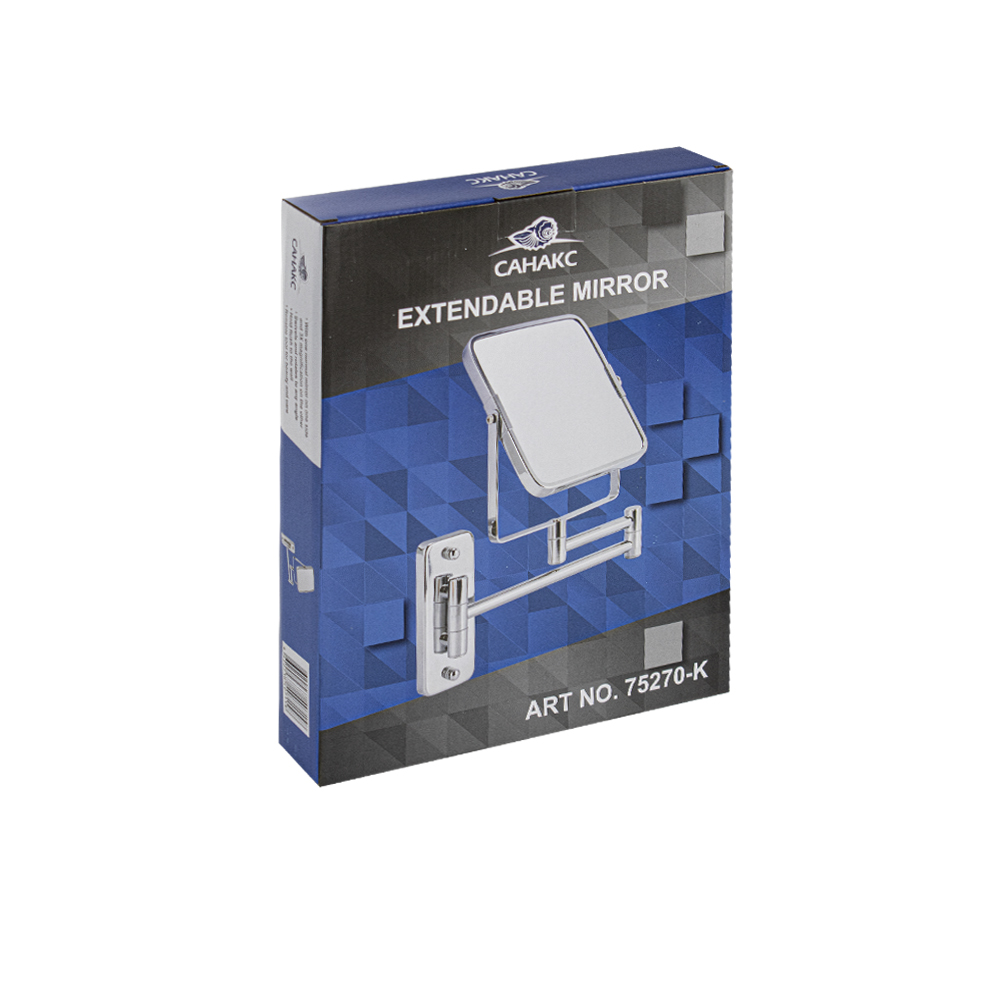 Зеркало настенное косметическое, раздвижное, двустороннее, с увеличительным эффектом, прямоугольное. Корпус изготовлен из прочной нержавеющей стали с хромированным покрытием, которое придает безупречный стильный вид и долговечность. Хромированное покрытие очень стойко переносит истирания и обеспечивает зеркальный блеск изделия. Установлено на металлический хромированный держатель, позволяющий поворачиваться вокруг своей оси и регулировать угол наклона модели. Снабжено складным механизмом «коленце», которое позволяет зеркалу выдвигаться на требуемое расстояние и компактно складываться. Одна из сторон зеркала имеет 3х-кратное увеличение  удобное  для косметических процедур, нанесения макияжа и бритья. Монтируется к стене при помощи крепления, входящего в комплект. Габаритные размеры: высота 300 мм, ширина зеркала 140 мм, общая длина 400 мм, посадочное седло 125*50  мм. Вес - 0,724 кг, объём - 0,0034 м3.