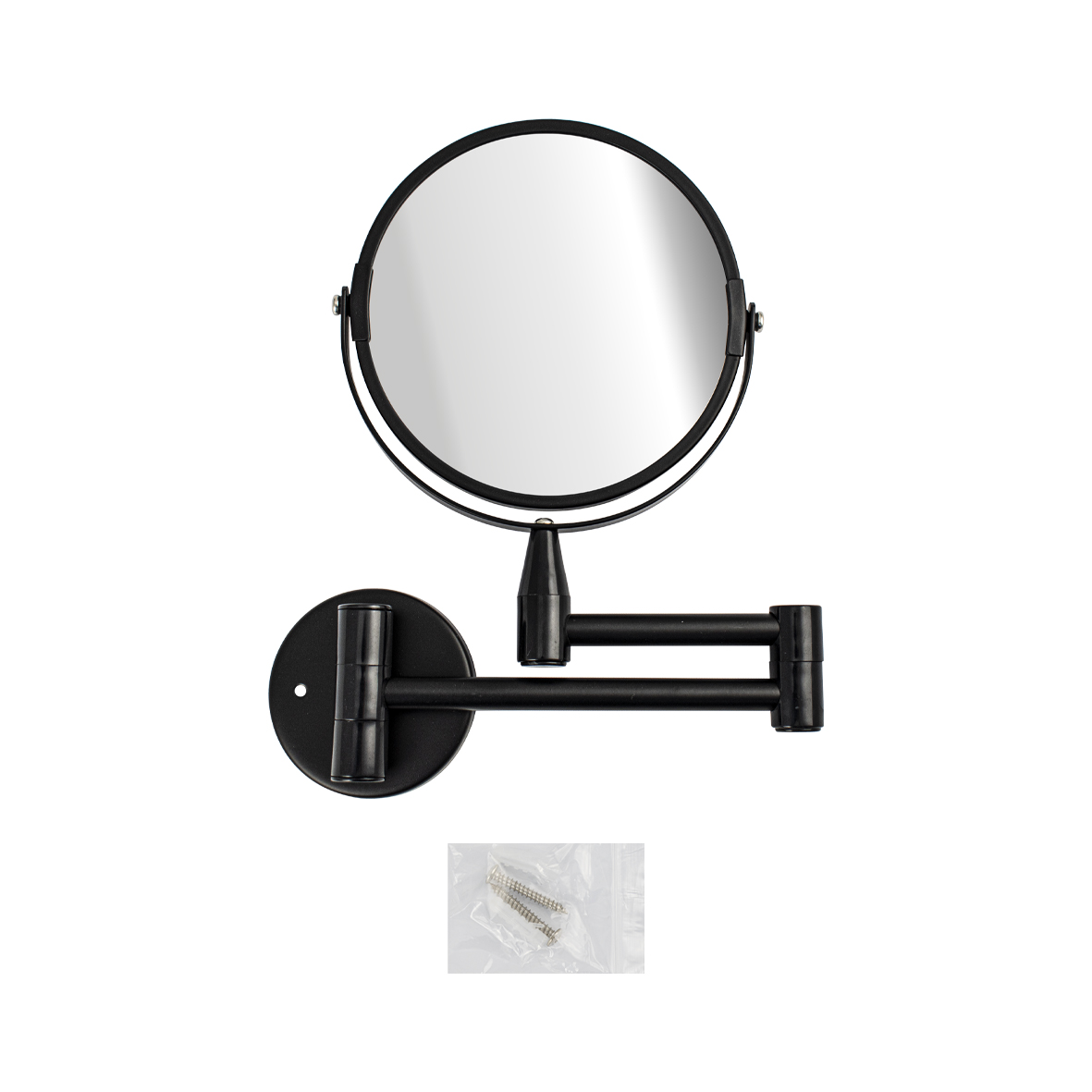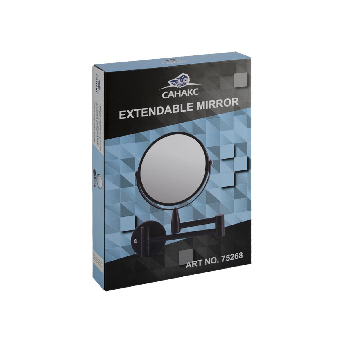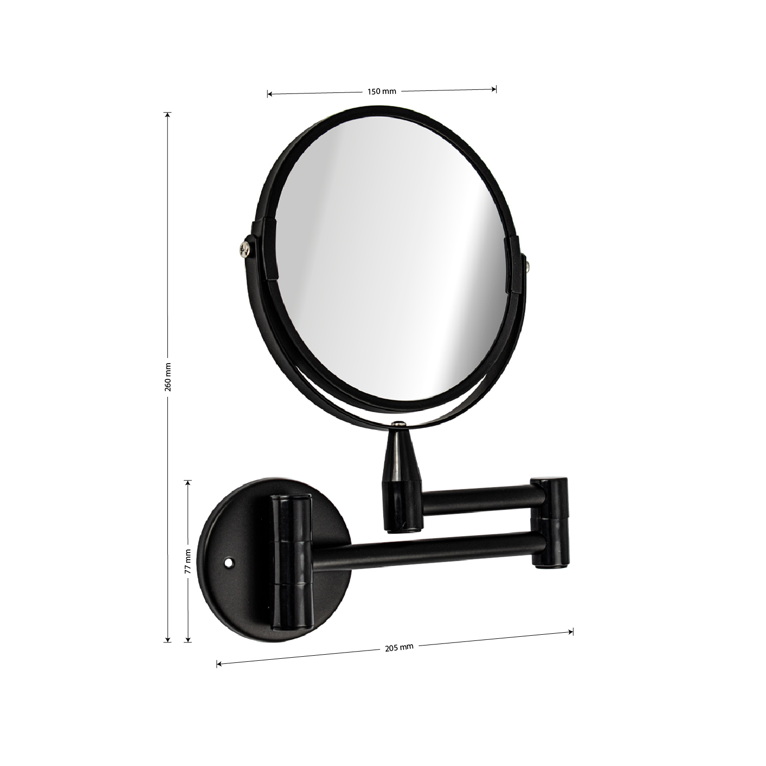 Зеркало настенное, косметическое, раздвижное, двустороннее, с увеличительным эффектом. Изготовлено из прочной нержавеющей стали с черным покрытием, которое придает безупречный стильный вид и долговечность. Черное покрытие очень стойко переносит истирания. Установлено на металлический черный держатель, позволяющий поворачиваться вокруг своей оси и регулировать угол наклона модели. Снабжено складным механизмом «коленце», которое позволяет зеркалу выдвигаться на требуемое расстояние и компактно складываться. Одна из сторон зеркала имеет 3х-кратное увеличение удобное для косметических процедур, нанесения макияжа и бритья. Монтируется к стене при помощи крепления, входящего в комплект. Габаритные размеры: диаметр 150 мм, высота 260 мм, общая ширина 205 мм, диаметр пятака 77 мм. Вес - 0,550 кг, объём - 0,00475 м3.