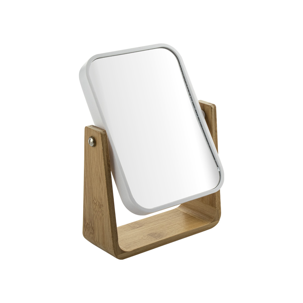 Зеркало настольное, косметическое, двустороннее, с увеличительным эффектом, основание из бамбука. Установлено на металлический держатель, позволяющий поворачиваться вокруг своей оси и регулировать угол наклона модели. Одна из сторон зеркала имеет 3х-кратное увеличение удобное для косметических процедур, нанесения макияжа и бритья. Устанавливается на любую поверхность. Габаритные размеры: высота 220 мм, зеркало 130 х 180 мм, низ бамбуковой подставки 160 х 60 мм. Вес - 0,500 кг, объём - 0,00224 м3.
