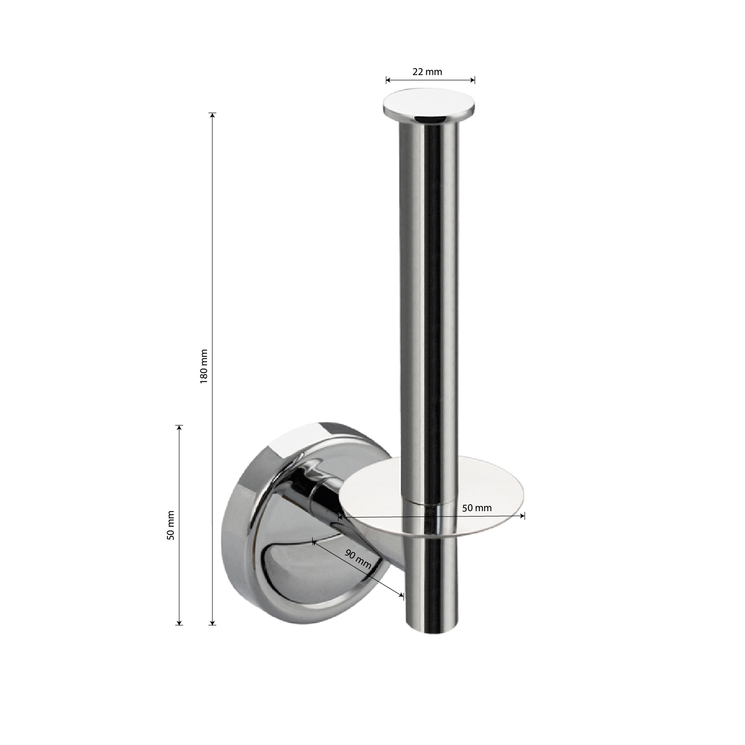 Держатель для туалетной бумаги, полотенца, ВЕРТИКАЛЬНЫЙ, без крышки, металлический, хромированный, стильный и функциональный элемент санузла. Держатель для туалетной бумаги легко и удобно крепится к стене при помощи фурнитуры входящей в комплект поставки. Материал изготовления — ЦАМ (цинк-алюминий-медь). Имеет специальное хромированное покрытие, которое защищает изделие от влаги и придает ему блестящий внешний вид. Удобно чистить и легко менять рулоны. Габаритные размеры: ширина 50 мм, высота 180 мм, глубина 90 мм, шток 110 мм. Вес - 0,250 кг, объём - 0,00064 м3.