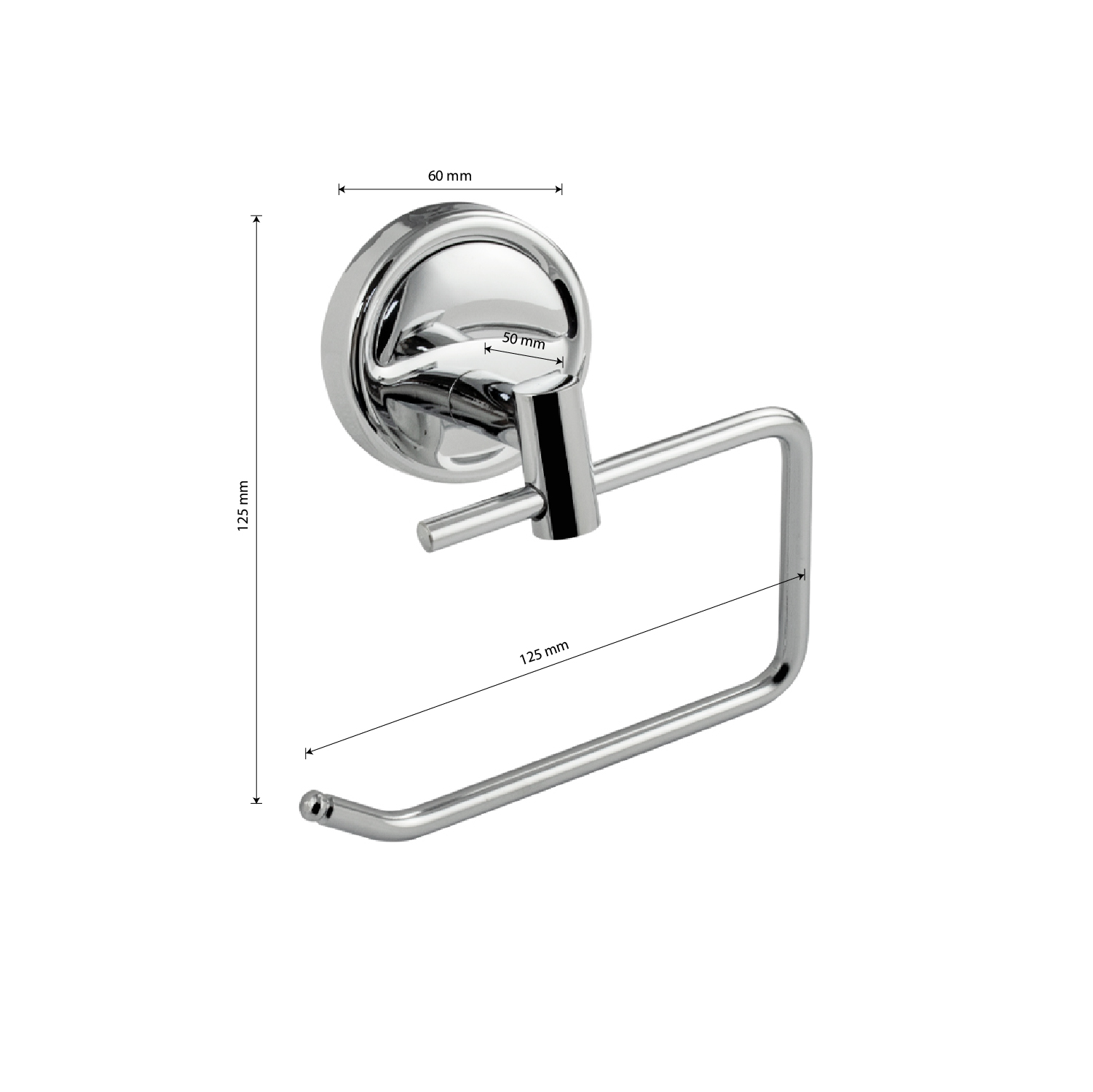 Бумагодержатель без крышки, металлический, хромированный, стильный и функциональный элемент санузла. Материал изготовления — ЦАМ (цинк-алюминий-медь). Держатель для туалетной бумаги легко и удобно крепится к стене при помощи фурнитуры входящей в комплект поставки. Имеет специальное хромированное покрытие, которое защищает изделие от влаги и придает ему блестящий внешний вид. Удобно чистить и легко менять рулоны. Габаритные размеры: ширина 125 мм, высота 125 мм, глубина 50 мм, основание 60 мм. Вес - 0,300 кг, объём - 0,00046 м3.