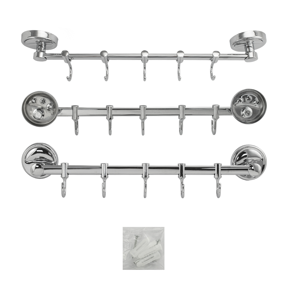 Держатель для полотенец металлический, хромированный, с пятью подвижными крючками. Материал изготовления — ЦАМ (цинк-алюминий-медь). Хромированное покрытие очень стойко переносит истирания и обеспечивает зеркальный блеск изделия. На держателе с легкостью можно размещать вещи для сушки или вешать, как полотенца, так и одежду перед походом в душ. Идеально подойдет не только для ванной, но и для кухни, а также для дачи или гаража - при необходимости на держатель можно вешать любые предметы. Изделие крепится к стене с помощью дюбелей и саморезов (входят в комплект). Габаритные размеры: длина 400 мм, высота 85 мм, глубина 50 мм, основание 60 мм. Вес - 0,400 кг, объём - 0,00096 м3.