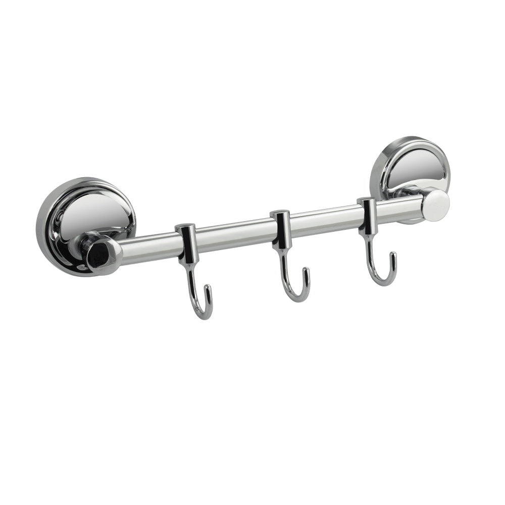 Держатель для полотенец металлический, хромированный, с тремя подвижными крючками. Материал изготовления — ЦАМ (цинк-алюминий-медь). Хромированное покрытие очень стойко переносит истирания и обеспечивает зеркальный блеск изделия. На держателе с легкостью можно размещать вещи для сушки или вешать, как полотенца, так и одежду перед походом в душ. Идеально подойдет не только для ванной, но и для кухни, а также для дачи или гаража - при необходимости на держатель можно вешать любые предметы. Изделие крепится к стене с помощью дюбелей и саморезов (входят в комплект). Габаритные размеры: длина 260 мм, диаметр посадочного седла 60 мм, глубина 50 мм, высота 85 мм. Вес - 0,300 кг, объём - 0,00076 м3