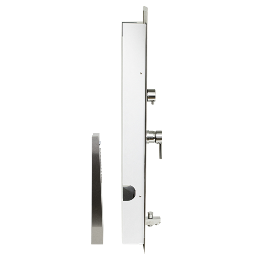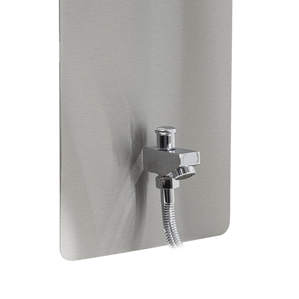 Ультрамодная дизайнерская гидромассажная ВРЕЗНАЯ душевая панель - "тропический душ" с двумя лейками и форсунками, 4 режима работы, с коротким изливом. Функциональность обеспечивают тропический, верхний каскадный душ, ручная лейка и форсунки для массажа спины. Эффектный внешний вид и практичность эксплуатации придает изделию из нержавеющей стали марки 304 матовая хромированная поверхность. Сочетание эстетики и максимального комфорта достигается за счет интегрированных гидромассажных форсунок и встроенного верхнего душа. Стильное и компактное оборудование предназначено для установки в ванну или любую душевую зону. Душевая панель позволит проводить оздоровительные процедуры в домашних условиях, гидромассажные форсунки окажут мягкое терапевтическое воздействие. Габаритные размеры: высота 920 мм, ширина 220 мм, длина верхнего душа 500 мм, длина излива 65 мм, длина шланга 150 см. Вес - 12,000 кг, объём - 0,10400 м3. Комплект: корпус / крепления / лейка / держатель для лейки / душевой шланг / излив / переключатель п