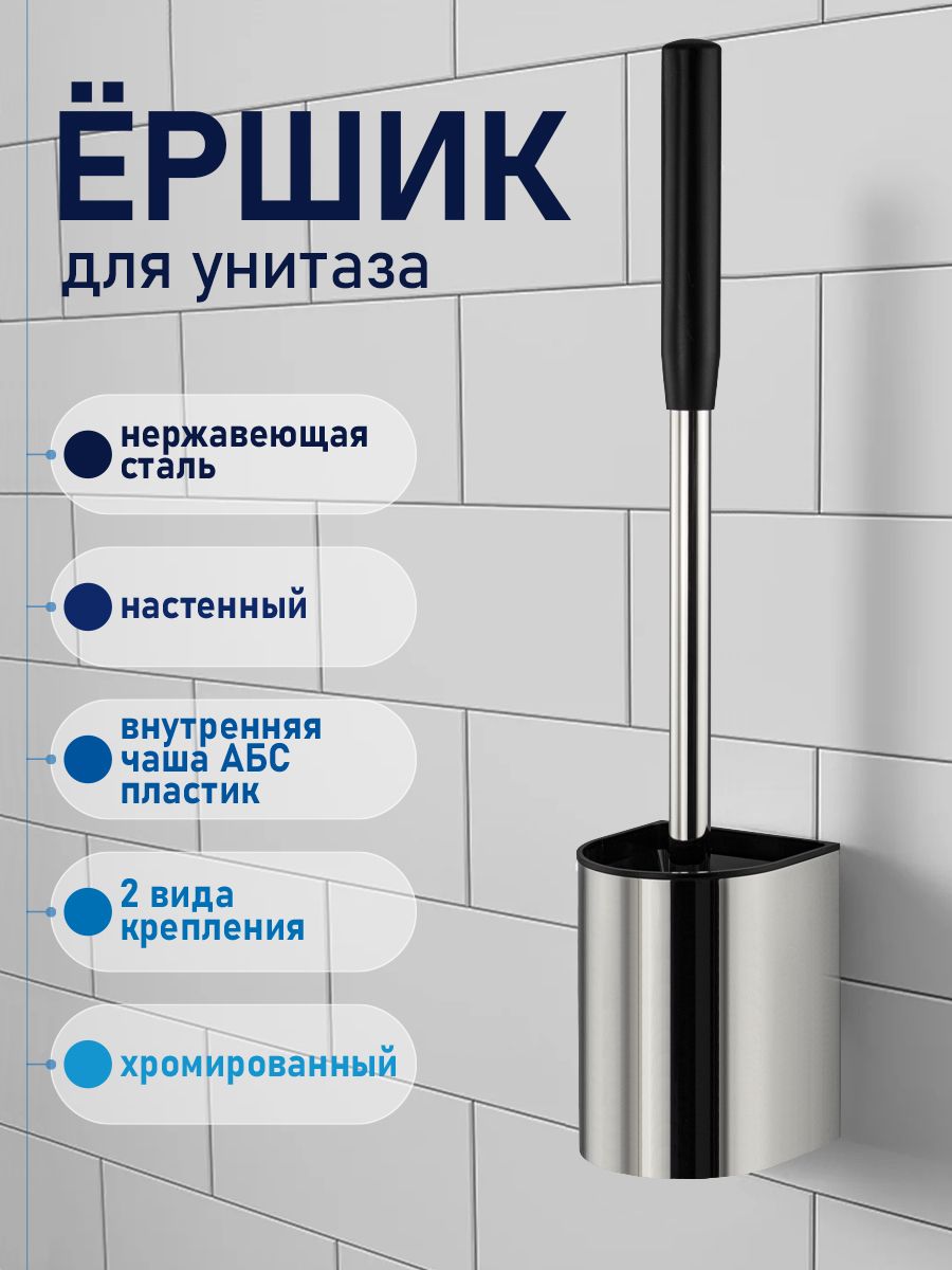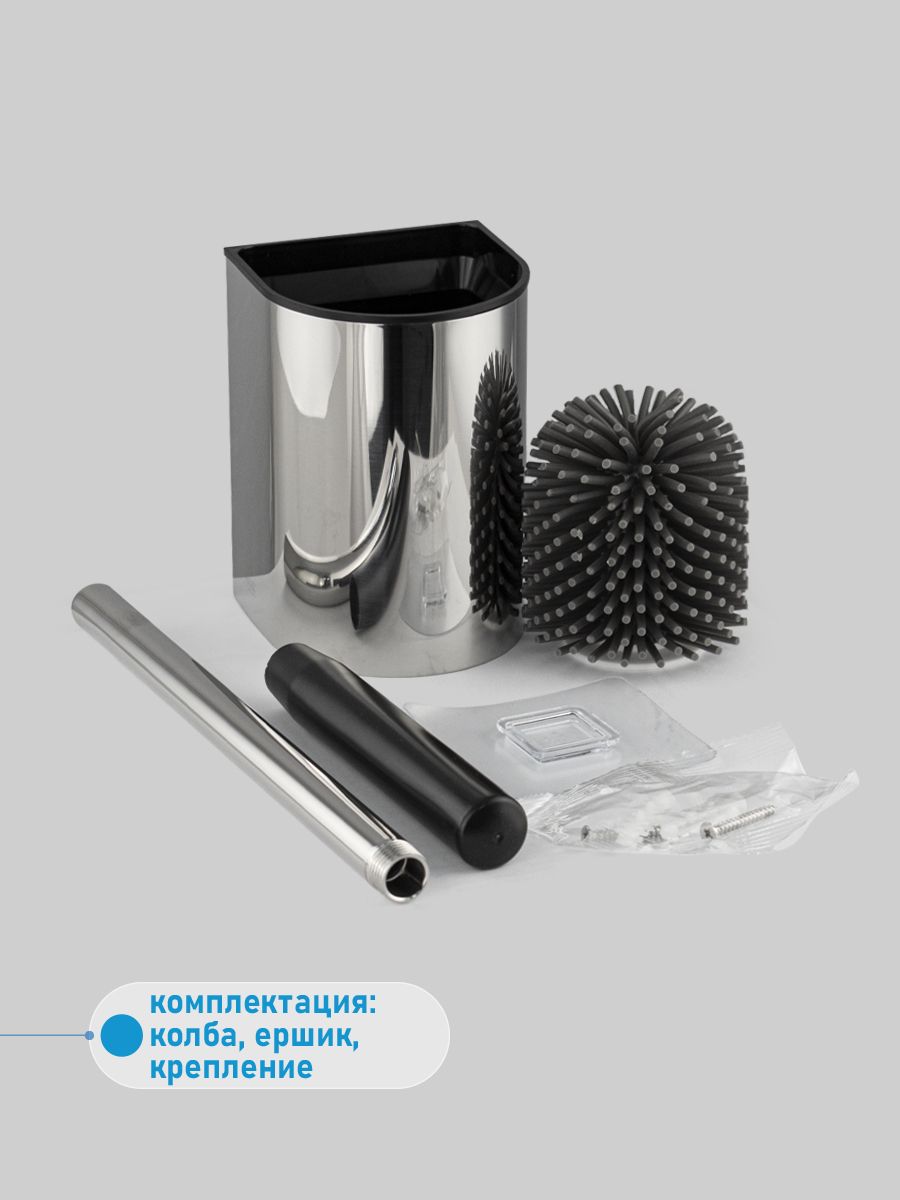 Ёршик с хромированной колбой из нержавеющей стали, настенный, с универсальным креплением ( самоклеящееся/дюбель ), необходимый аксессуар любой туалетной комнаты. Приспособление обеспечит порядок и правильное хранение гигиенических принадлежностей. Изделие выполнено из с металла с черным покрытием. Силиконовая щетина ерша гарантирует отличный результат очистки санузлов. Такое сочетание материалов делает конструкцию прочной и долговечной. Ёршик легко крепится к стене при помощи фурнитуры входящей в комплект поставки. Имеет специальное покрытие, которое защищает изделие от влаги и придает ему стильный внешний вид. Габаритные размеры: высота 425 мм, высота колбы 117 мм, ширина 85 мм, глубина 83 мм. Вес - 0.49 кг, объём - 0.0024 м3.