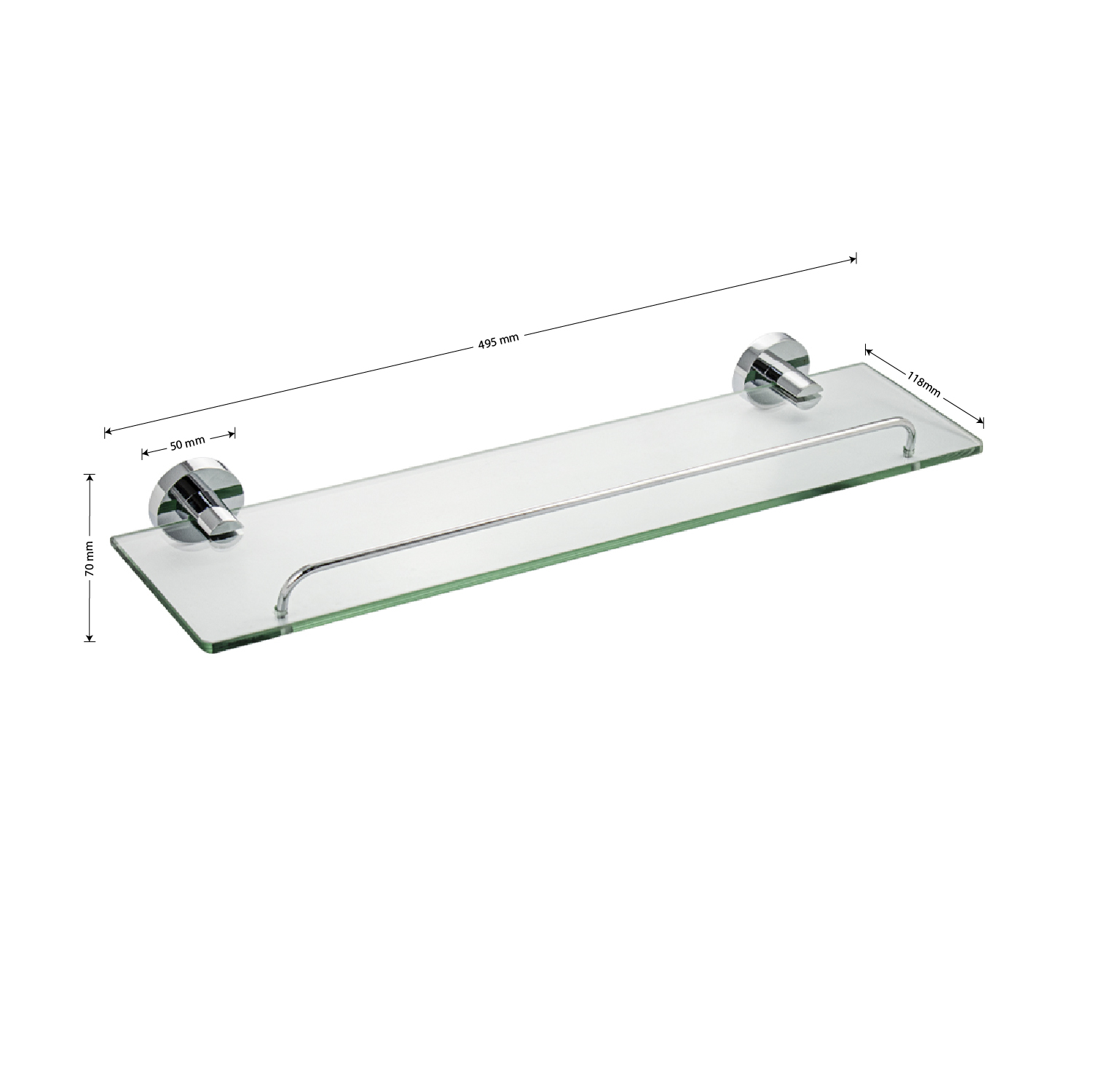 Прямоугольная полка из прозрачного стекла с полированными краями о которые невозможно порезаться, с надежной фиксацией к стене с помощью крепления из металла с хромированным покрытием, идеально подходит для хранения различных ванных принадлежностей. Полочка изготовлена из качественного прозрачного стекла и имеет бортик, предотвращающий падение ванных принадлежностей. Полка для ванной функциональное и практичное решение для любого интерьера. Хромированное покрытие креплений очень стойко переносит истирания и обеспечивает зеркальный блеск изделия. Идеально подойдет не только для ванной, но и для кухни. Изделие крепится к стене с помощью дюбелей и саморезов (входят в комплект). Габаритные размеры: ширина 495 мм, глубина 118 мм, высота 70 мм, толщина стекла 7 мм. Вес - 1,52 кг, объём - 0.00345 м3.