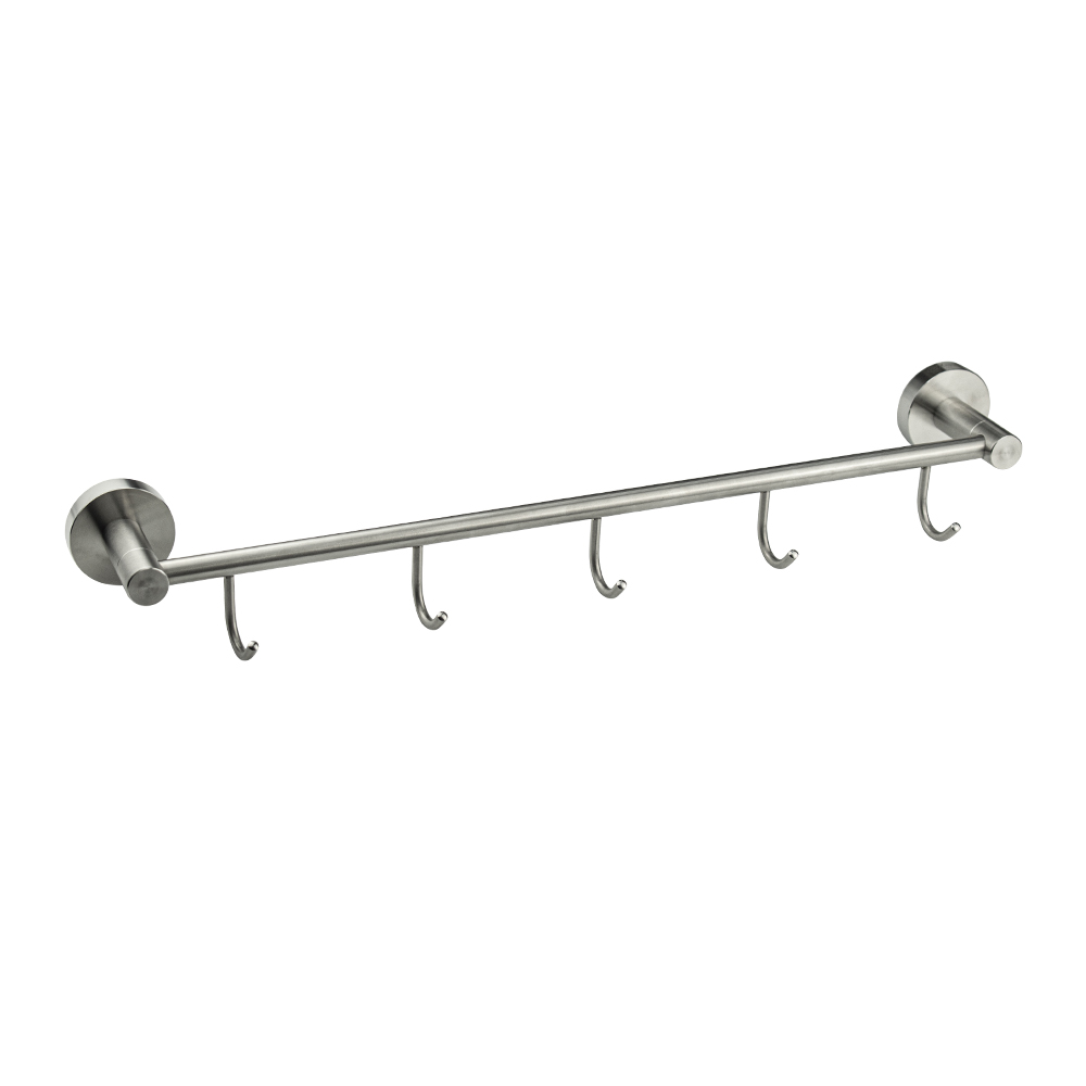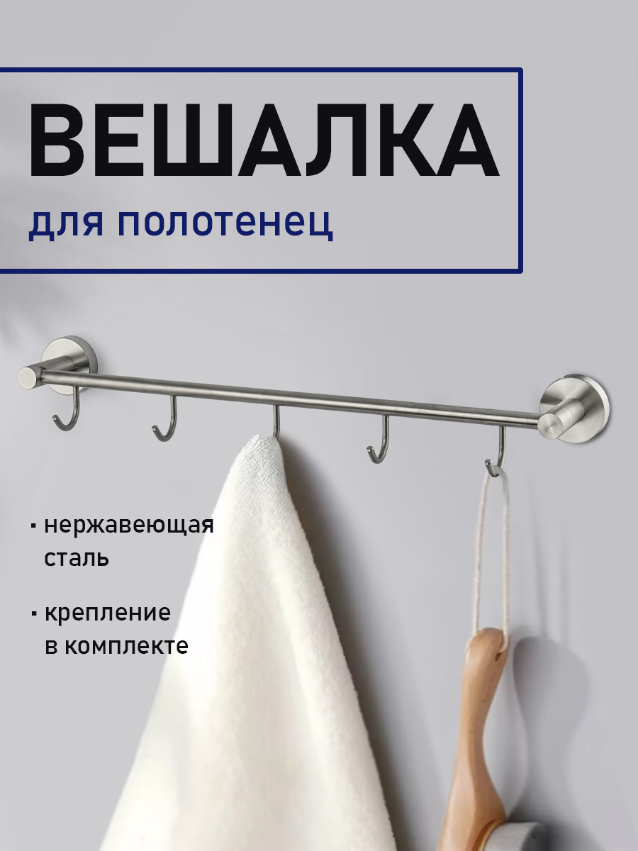 Держатель для полотенец металлический с пятью крючками. Изготовлен из прочной нержавеющей стали марки SUS 304 с матовым покрытием, которое придает безупречный стильный вид и долговечность. На держателе с легкостью можно размещать вещи для сушки или вешать, как полотенца, так и одежду перед походом в душ. Идеально подойдет не только для ванной, но и для кухни, а также для дачи или гаража - при необходимости на держатель можно вешать любые предметы. Изделие крепится к стене с помощью дюбелей и саморезов (входят в комплект). Размеры: длина 490 мм, высота 55 мм, глубина 85 мм. Вес - 0,500 кг, объём - 0,00336 м3.