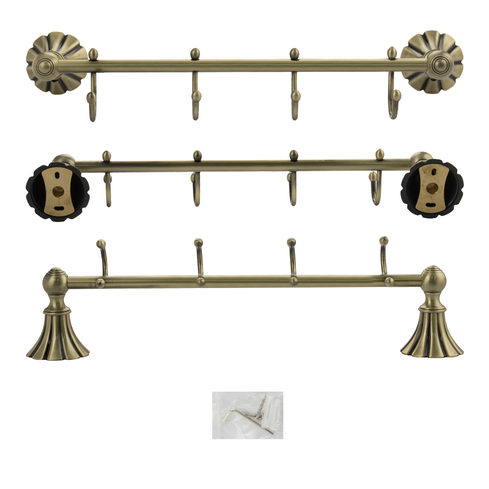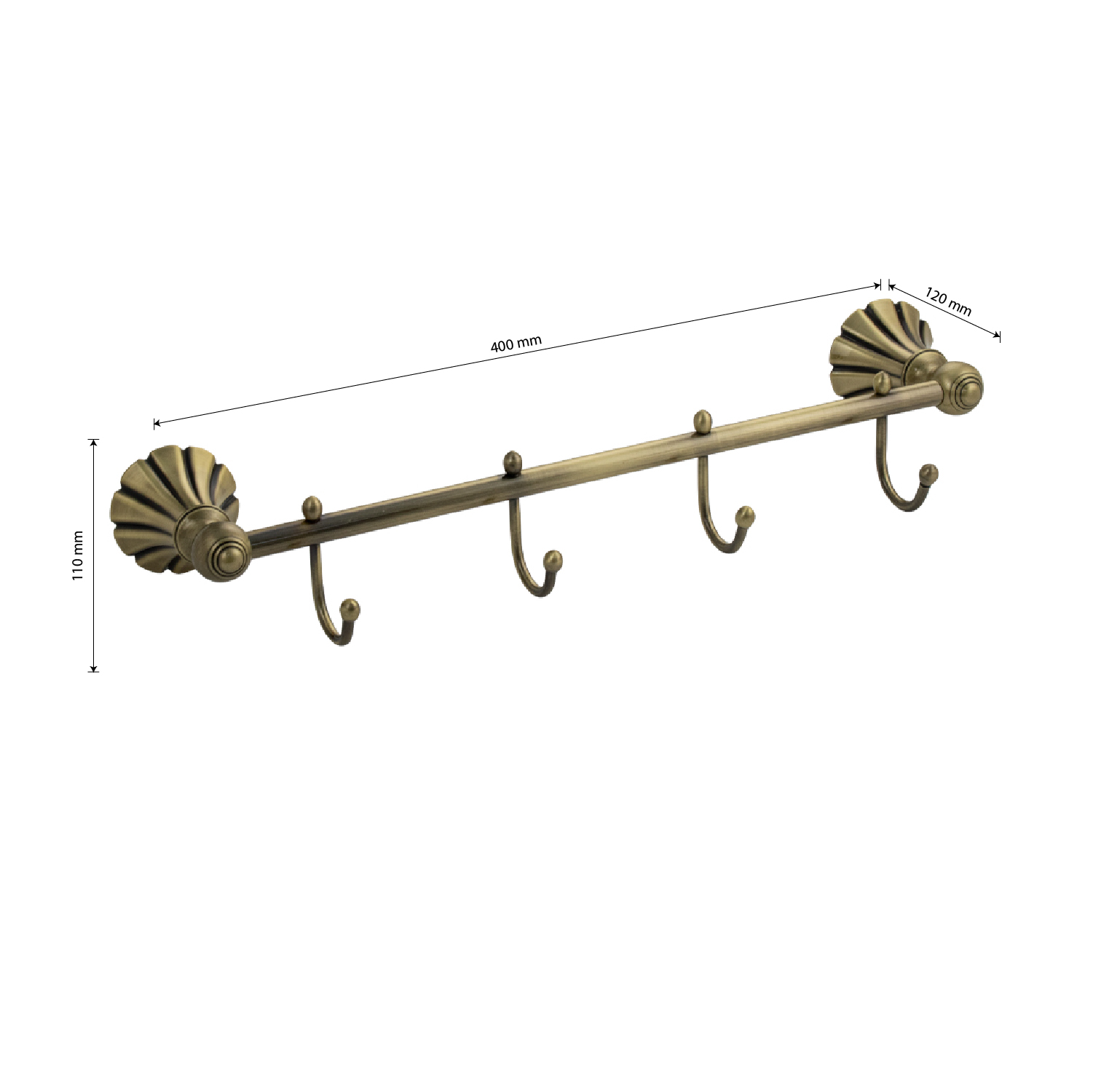 Держатель для полотенец металлический, с четырьмя крючками. Материал изготовления — латунь. Бронзовое, матовое покрытие очень стойко переносит истирания и обеспечивает безупречный стильный вид изделия и долговечность. На держателе с легкостью можно размещать вещи для сушки или вешать, как полотенца, так и одежду перед походом в душ. Идеально подойдет не только для ванной, но и для кухни, а также для дачи или гаража - при необходимости на держатель можно вешать любые предметы. Изделие крепится к стене с помощью дюбелей и саморезов (входят в комплект). Габаритные размеры: длина 400 мм, высота 110 мм, глубина 120 мм. Вес - 0,700 кг, объём - 0,00324 м3