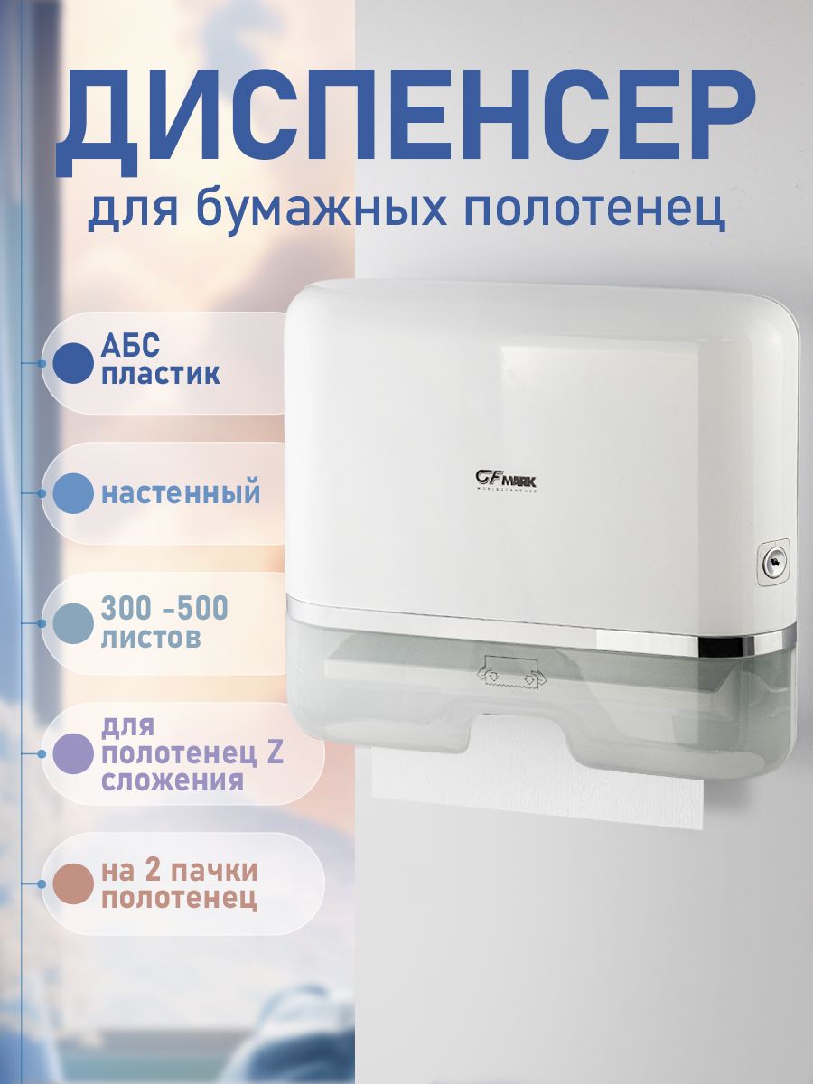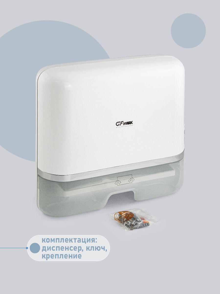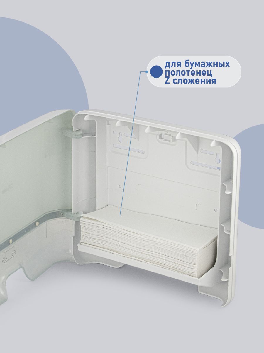 Диспенсер для бумажных полотенец Z и V сложения, на две пачки, с ключом, белый, из высокопрочного пластика АБС. Антивандальный, диспенсер вместимостью 300 - 500 листов. Прямоугольной формы компактный, вместительный и надежный. Окно - индикатор позволяет легко осуществлять контроль за наличием полотенец, а встроенный замок обезопасит от кражи расходного материала. Привлекательный дизайн подойдет для самых разных интерьеров. Ультратонкий диспенсер обеспечивает гигиеничный поштучный отбор. Большое смотровое окошко позволяет контролировать наличие полотенец. Габаритные размеры: высота 270 мм, ширина 300 мм, глубина 100 мм. Вес - 1,0 кг, объем - 0,00955 м3.