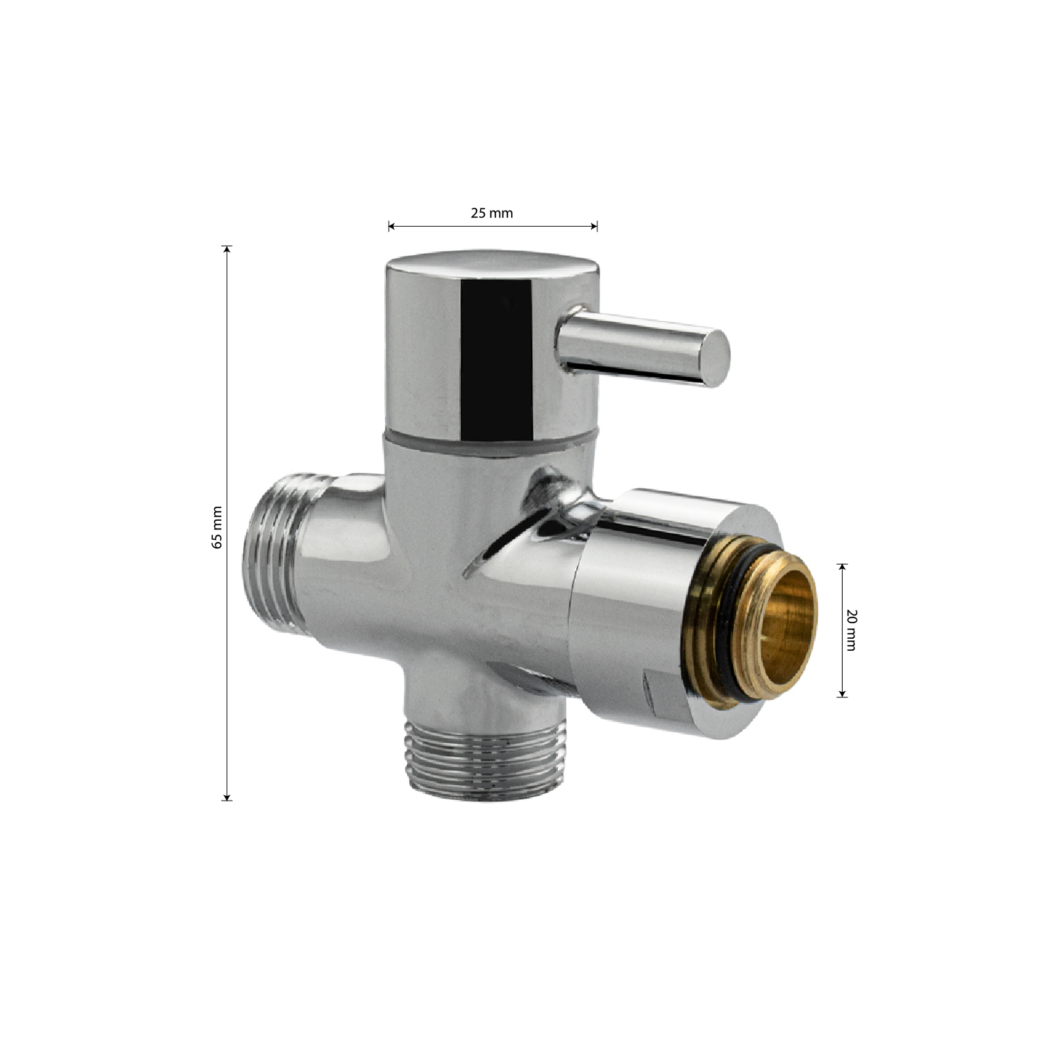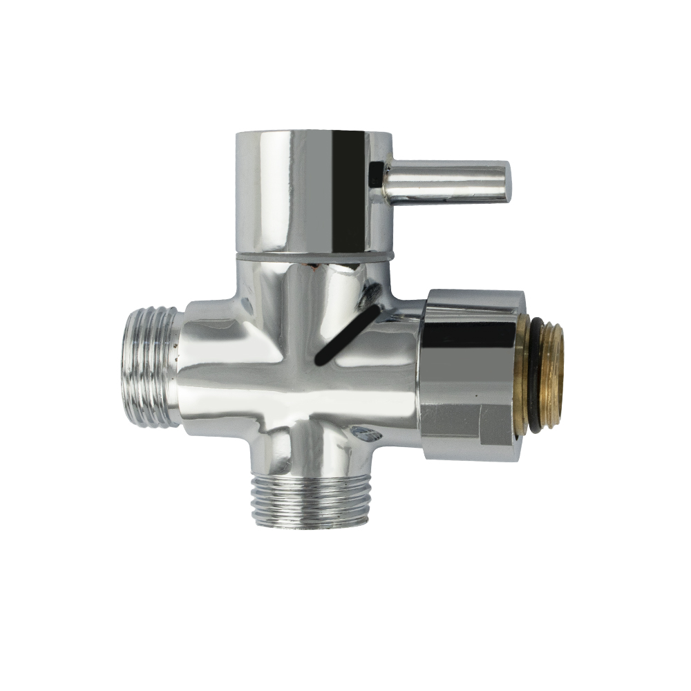 Переключатель душа латунный, поворотный, хромированный, к стойке тропический душ. Угол поворота 90°. Применяется для перенаправления потока воды с излива в душевой кран и обратно. Входная резьба 3/4, выходная резьба 1/2, выход на лейку 1/2. Габаритные размеры: высота 65 мм, диаметр 25 мм. Вес - 0,230 кг, объём - 0,00030 м2. Комплектация: дивертор, резиновая прокладка.