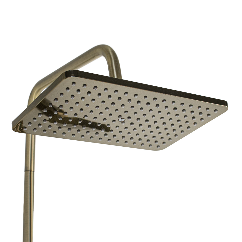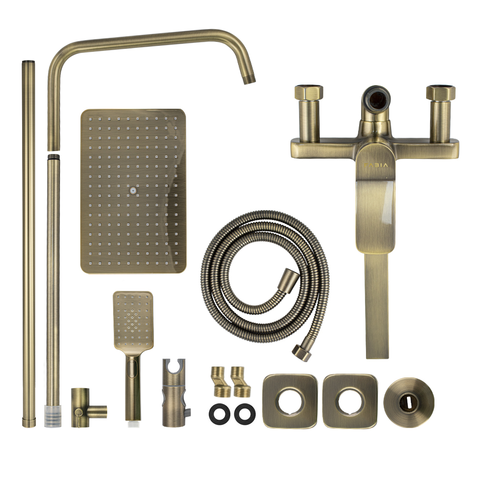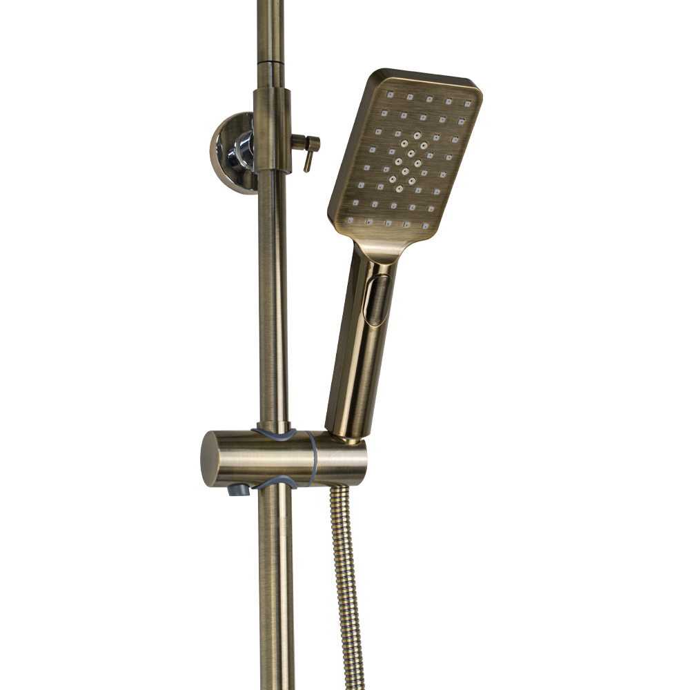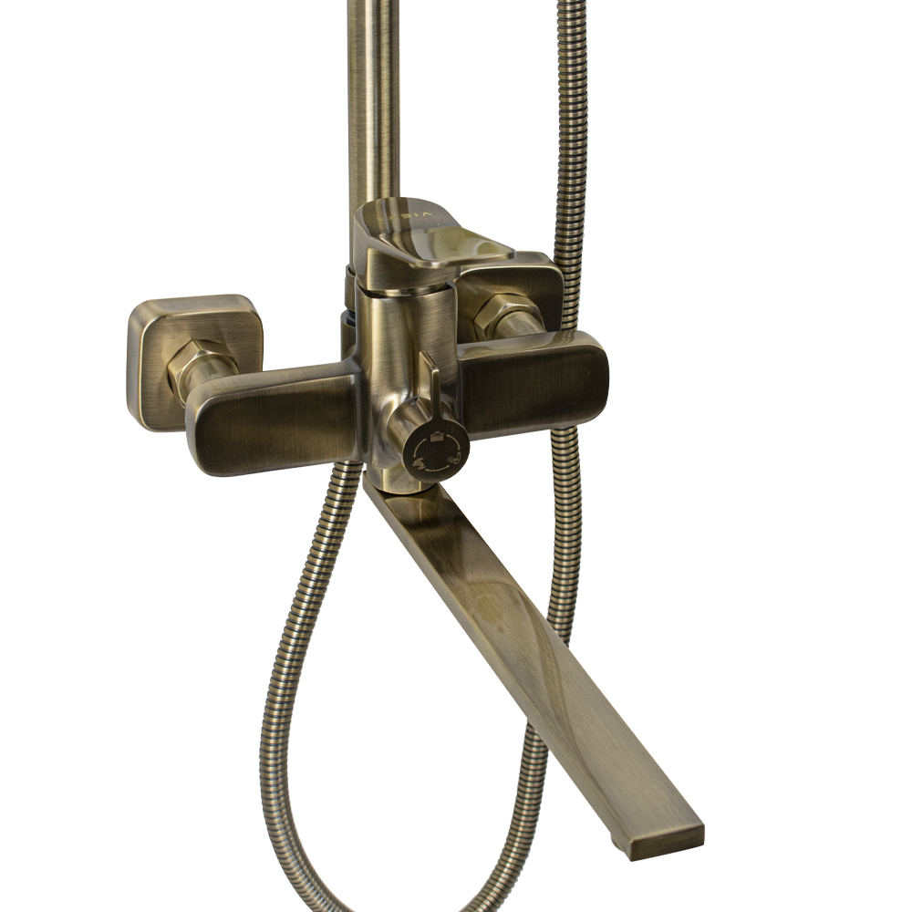 Смеситель + стойка душевая телескопическая "тропический душ" с двумя лейками в ванную / душевую комнату, цвет бронза. Смеситель шаровый с длинным поворотным изливом, душевым шлангом и лейкой, дивертор переключения в трёх положениях. Материал изготовления — цам. Картридж d = 40 мм, ручка литая, аэратор для экономии воды, чашки и эксцентрики. Душевая, регулируемая по высоте стойка с присоединением к корпусу смесителя и дополнительным креплением к стене и большой круглой лейкой с эффектом тропического душа. Габаритные размеры: ширина смесителя 150 мм, высота 160 мм, длина излива корпуса 300 мм, высота телескопической стойки 800 -1200 мм, длина излива стойки 330 мм, душевая лейка 80*255 мм, круглая лейка тропический душ 290*190 мм, шланг 150 см. Вес - 4,58 кг, объём - 0,02847 м3. В комплекте корпус с изливом, чашки, эксцентрики, прокладки, стойка, дивертор, шланг, две лейки, крепления.