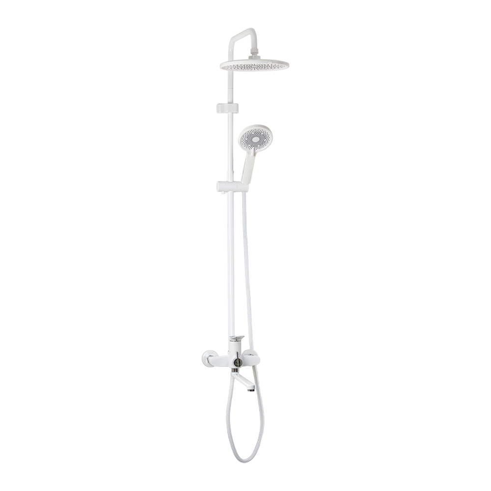 Смеситель + стойка душевая телескопическая "тропический душ" с двумя лейками в ванную / душевую комнату, хромированный с покрытием белая эмаль. Смеситель шаровый с длинным  поворотным изливом, душевым шлангом и лейкой, дивертор переключения в трёх положениях. Материал изготовления — латунь. Картридж d = 40 мм, ручка литая, аэратор для экономии воды, чашки и эксцентрики. Душевая, регулируемая по высоте стойка с присоединением к корпусу смесителя и дополнительным креплением к стене и большой круглой лейкой с эффектом тропического душа. Габаритные размеры: ширина смесителя 150 мм, высота 150 мм, длина излива корпуса 300 мм, высота телескопической стойки 800-1200 мм, длина излива стойки 320 мм, круглая душевая лейка 120 мм, круглая лейка тропический душ 225 мм, шланг 150 см. Вес - 4.12 кг, объём - 0.02847 м3. В комплекте корпус с изливом, чашки, эксцентрики, прокладки, стойка, дивертор, шланг, две лейки, крепления.