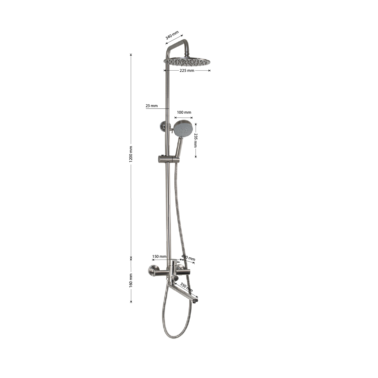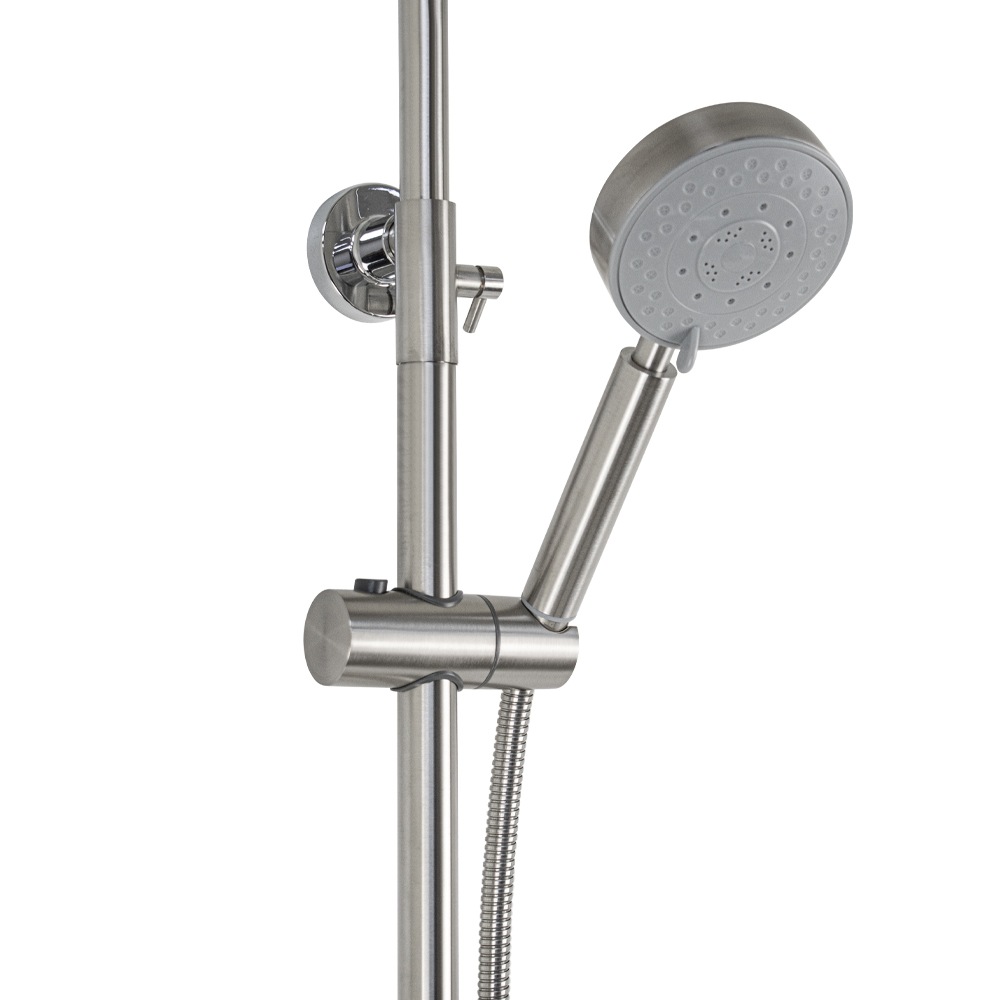 Смеситель + стойка душевая телескопическая "тропический душ" с двумя лейками в ванную / душевую комнату, матовая, из нержавеющей стали марки SUS 304. Смеситель шаровый, овальный корпус с длинным плоским поворотным изливом, душевым шлангом и лейкой, дивертор переключения в трёх положениях. Картридж d = мм, ручка литая, аэратор для экономии воды, чашки и эксцентрики. Душевая стойка с присоединением к корпусу смесителя и дополнительным креплением к стене и большой круглой лейкой с эффектом тропического душа. Габаритные размеры: ширина смесителя 150 мм, высота 160 мм, длина излива корпуса 350 мм, высота телескопической стойки 1200 мм, длина излива стойки 340 мм, круглая душевая лейка d = 100 мм, круглая лейка тропический душ d = 225 мм, шланг 150 см. Вес - кг, объём - м3. В комплекте корпус с изливом, чашки, эксцентрики, прокладки, стойка, дивертор, шланг, две лейки, крепления.