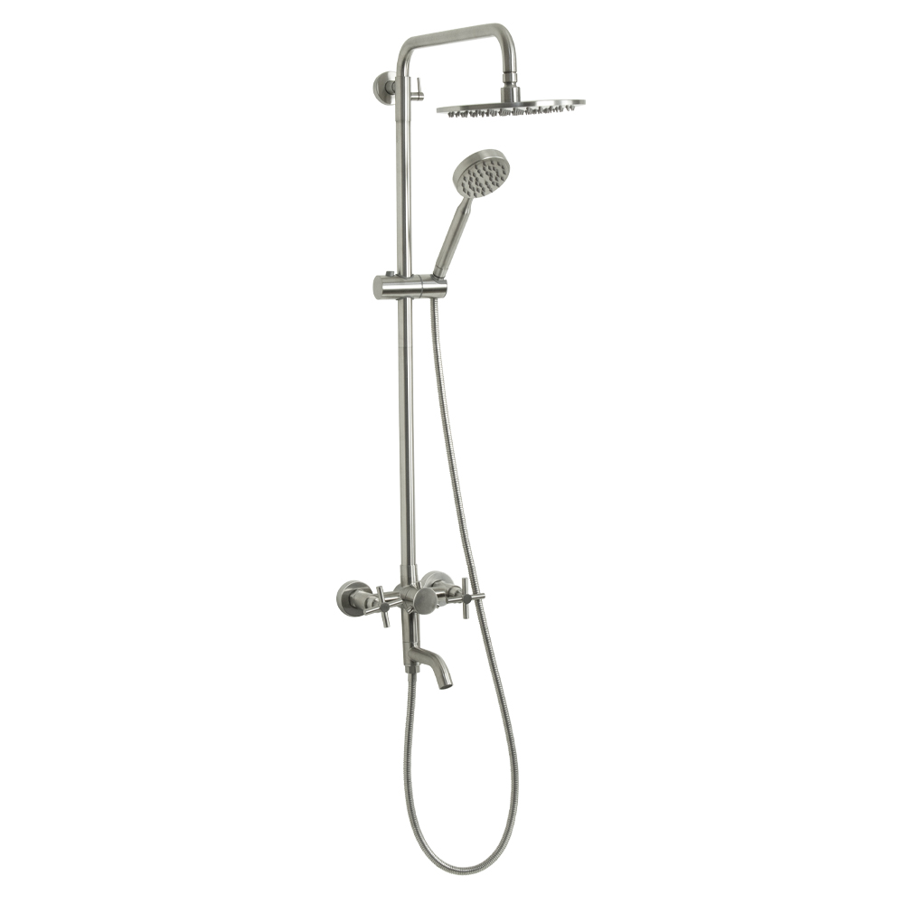 Смеситель + стойка душевая телескопическая "тропический душ" с двумя лейками, металлокерамика, в ванную / душевую комнату, матовая, из нержавеющей стали марки 304. Смеситель м/к с коротким поворотным изливом, душевым шлангом и лейкой, дивертор переключения в трёх положениях. Кранбукса м/к, ручка крест, аэратор для экономии воды, чашки и эксцентрики. Душевая, регулируемая по высоте стойка с присоединением к корпусу смесителя и дополнительным креплением к стене и большой круглой лейкой с эффектом тропического душа. Габаритные размеры: ширина смесителя 150 мм, высота корпуса 150 мм, длина излива корпуса 120 мм, высота телескопической стойки 900 мм, длина излива стойки 380 мм, круглая душевая лейка d = 90 мм, круглая лейка тропический душ d = 220 мм, шланг 150 см. Вес - 4,400 кг, объём - 0,03630 м3. В комплекте корпус с изливом, чашки, эксцентрики, прокладки, стойка, дивертор, шланг, две лейки, крепления.