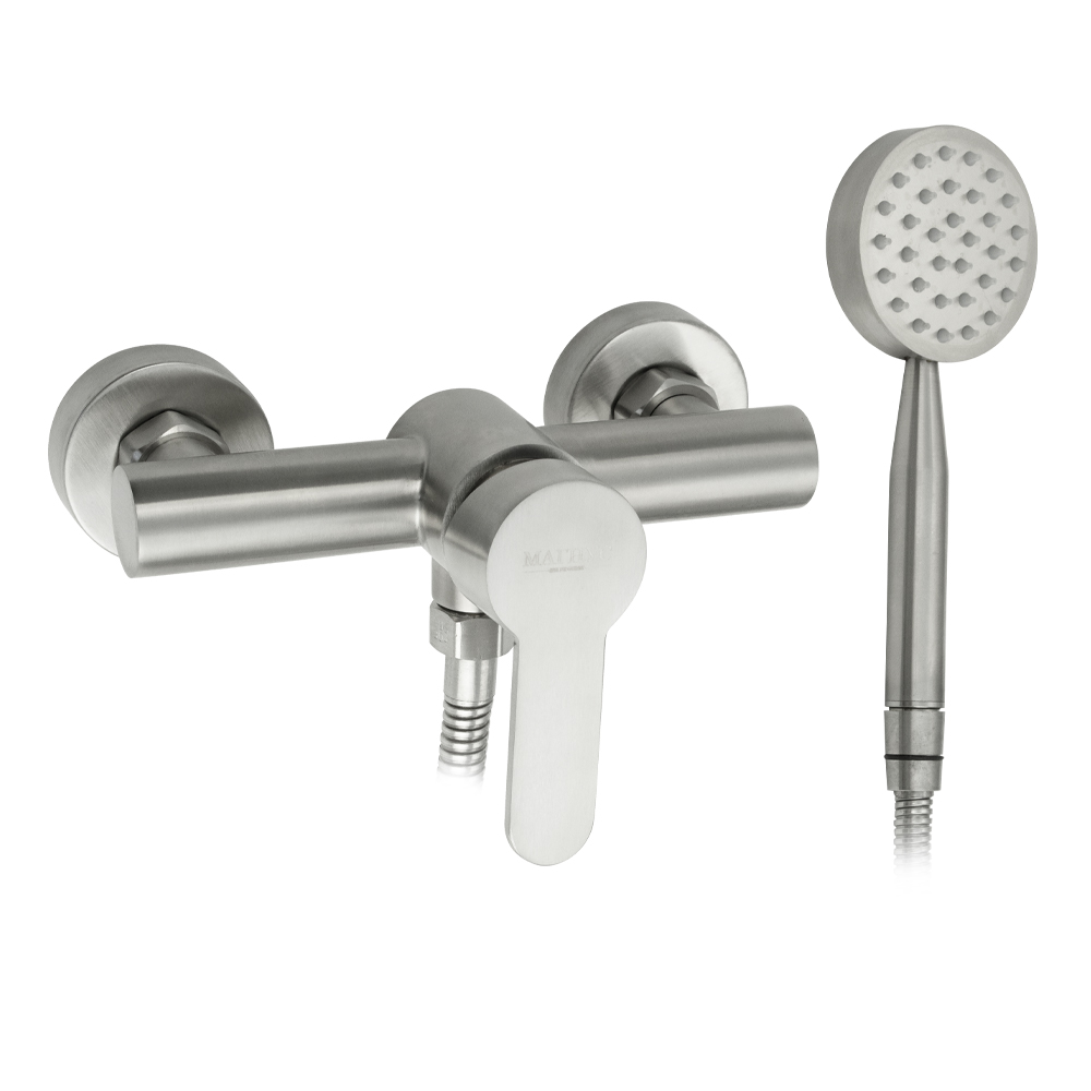 Смеситель матовый из нержавеющей стали марки 304, в ванную / душевую комнату / кабинку, без излива, литой корпус, шаровый. Картридж d = 40 мм, литая ручка, чашки и эксцентрики. Габаритные размеры: ширина 150 мм, высота корпуса 105 мм, душевая лейка d = 85 мм, шланг 150 см. Вес - 1,500 кг, объём - 0,00730 м3. В комплекте паспорт, корпус, душевая лейка, шланг, кронштейн, комплект крепежа и прокладок.