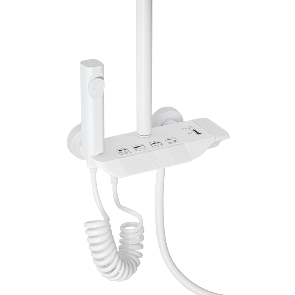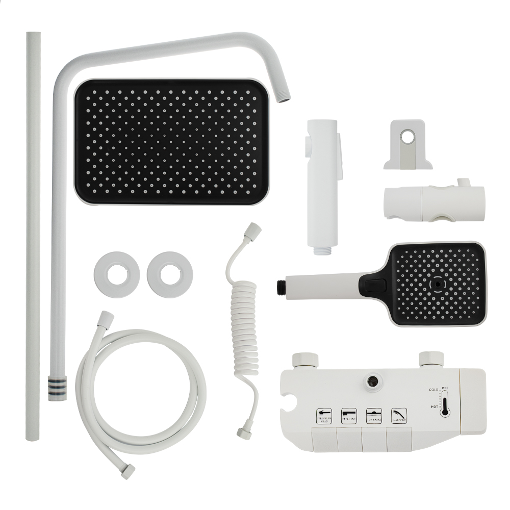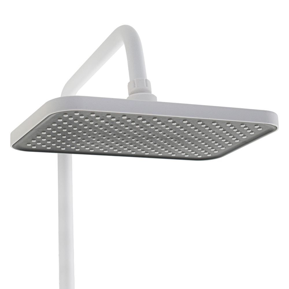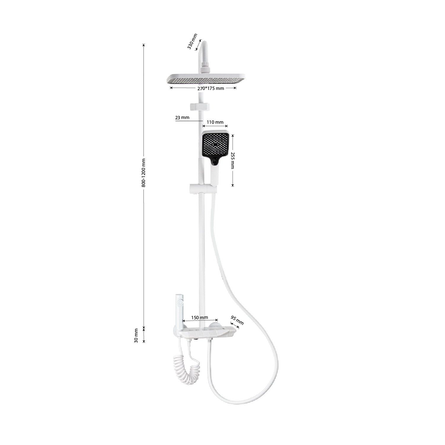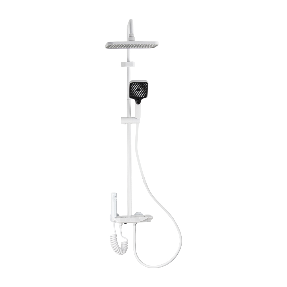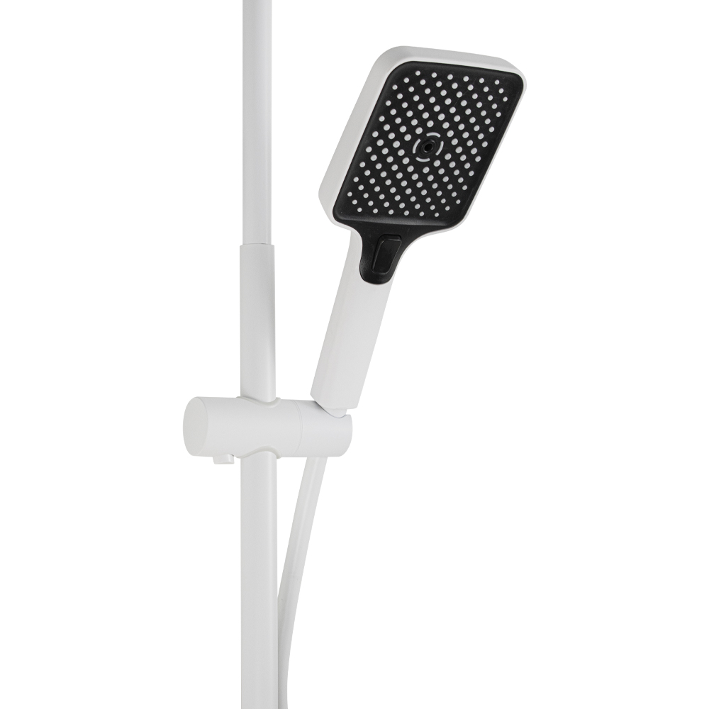Смеситель + стойка душевая телескопическая "тропический душ" с двумя лейками и гигиеническим душем, в ванную / душевую комнату из АБС пластика. Смеситель c клавишным переключением режимов подачи воды на корпусе, с душевым шлангом и лейкой. Картридж d = мм, ручка литая, аэратор для экономии воды, чашки и эксцентрики душевая, регулируемая по высоте стойка с присоединением к корпусу смесителя и дополнительным креплением к стене и большой квадратной лейкой с эффектом тропического душа. Габаритные размеры: ширина смесителя 150 мм, высота 30 мм, длина излива корпуса 95 мм, высота телескопической стойки 800-1200 мм, длина излива стойки 330 мм, душевая лейка 110 мм, лейка тропический душ 270*175 мм, шланг 150 см. Вес - 3.93 кг, объём - 0.03093 м3. В комплекте корпус, чашки, эксцентрики, прокладки, стойка, шланг, две лейки, крепления.