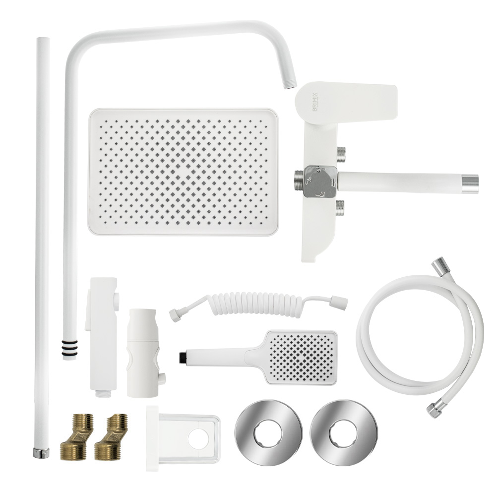 Смеситель + стойка душевая телескопическая "тропический душ" с двумя лейками и гигиеническим душем в ванную и душевую комнату, цвет белый. Смеситель шаровый с коротким поворотным изливом, душевым шлангом и лейкой, дивертор переключения в трёх положениях. Картридж d = 35 мм, ручка литая, аэратор для экономии воды, чашки и эксцентрики. Душевая, регулируемая по высоте стойка с присоединением к корпусу смесителя и дополнительным креплением к стене и большой круглой лейкой с эффектом тропического душа. Габаритные размеры: ширина смесителя 150 мм, высота 210 мм, длина излива корпуса 105 мм, высота стойки 800 - 1100 мм, длина излива стойки 330 мм, душевая лейка 95*250 мм, лейка тропический душ 300*200 мм, шланг 150 см. Вес - 3,68 кг, объем - 0,3133 м3.
